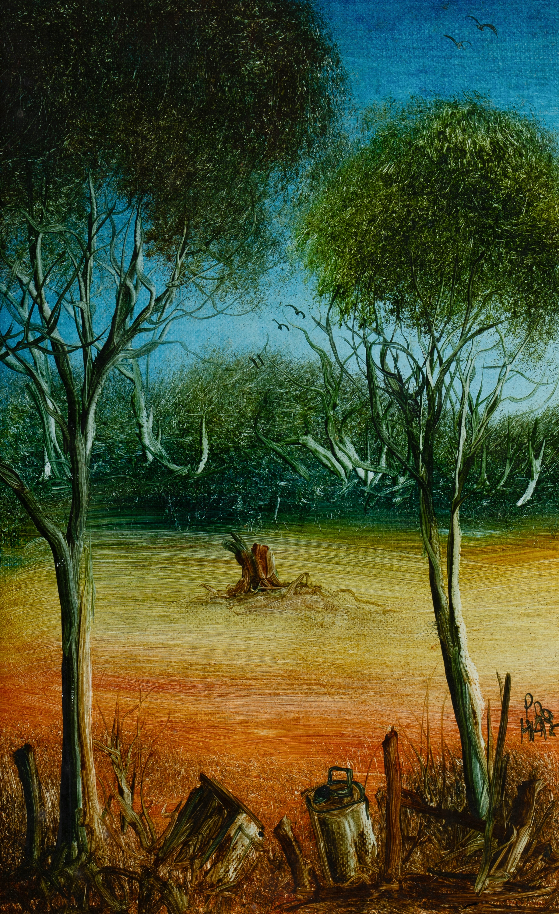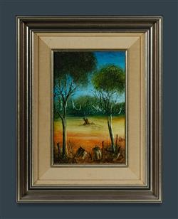 HART, Pro (1928-2006) 'Landscape,' c.1984. Purchased from Pro Hart Gallery 20th October, 1984. Oil on Canvas Board 33.5x21.5cmEstimate $1,500-2,000