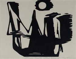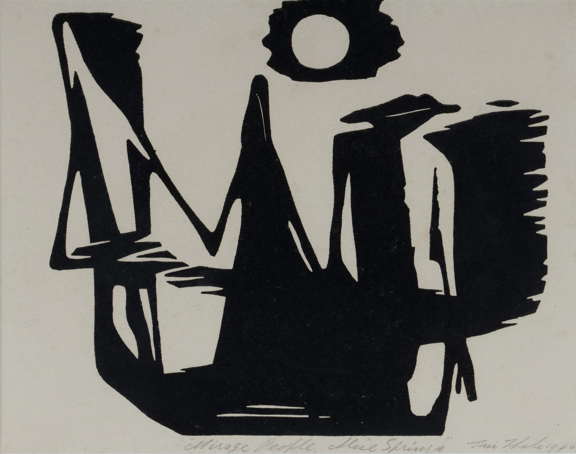 THAKE, Eric (1904-1982) 'Mirage People, Alice Springs,' 1946, Titled, signed and dated in pencil. Linocut 14.5x18cm (sight)Estimate $500-700