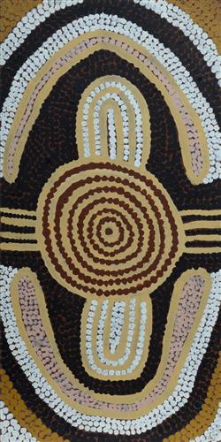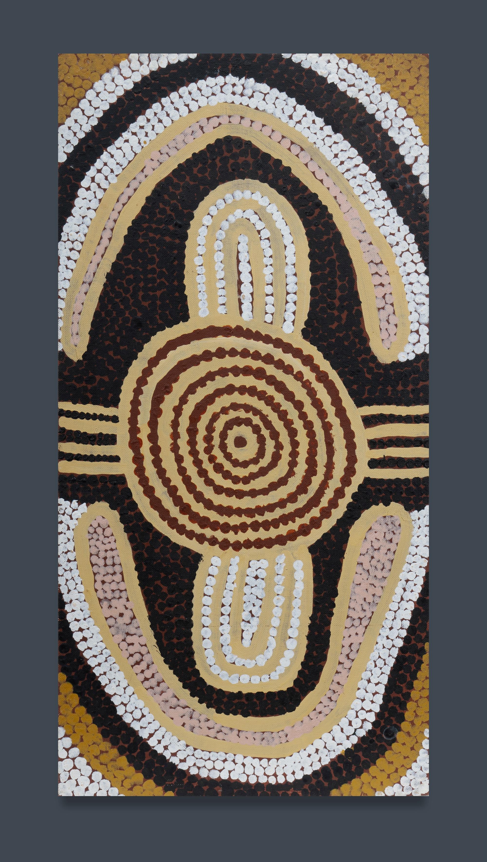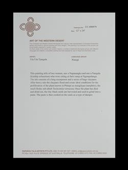 TJANGALA, Uta Uta (Aboriginal 1926-1990) Napanangka and Nangala Women Sitting at Camp at Ngurapalangu, 1989. Acrylic on Canvas Board 61x30.5cm PROVENANCE: Papunya Tula Artists, cat #UU890979 (certificate included)Estimate $2,000-3,000