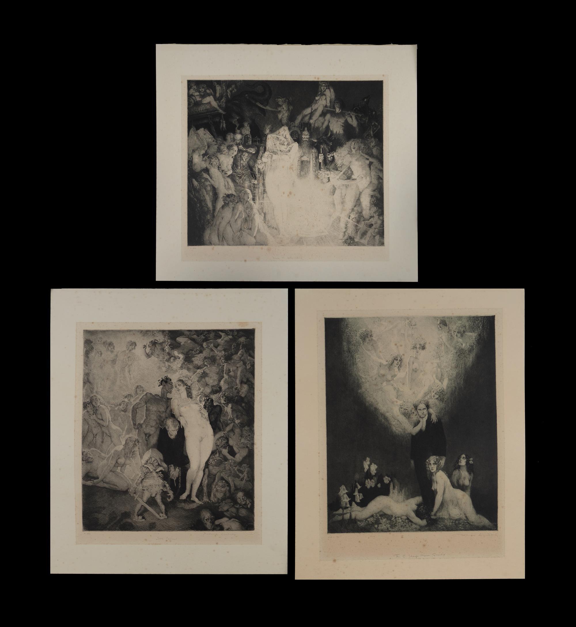LINDSAY, Norman (1879-1969) (3) 'Enter the Magicians,' 224/550 (30x35.5cm image); 'Self Portrait,' 236/550 (35.5x30cm image); and 'The C. Sharp Minor Quartet,' 170/550 (38x30cm image) Facsimile Etching (3)Estimate $300-600