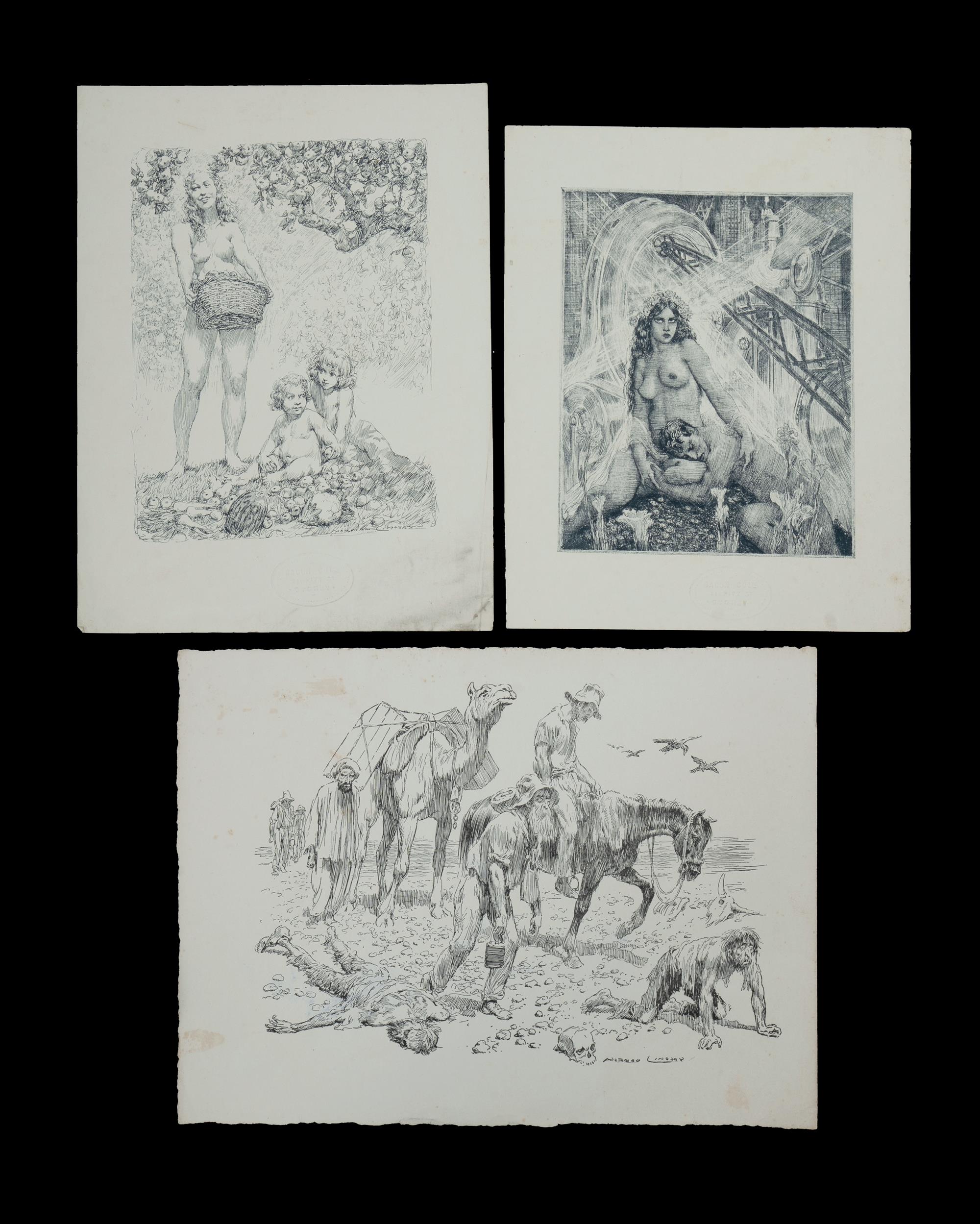 LINDSAY, Norman (1879-1969) (3) Three Printer's Proofs of Illustrated Works. Frontispiece from 'The Birdsville Track and other poems,' by Douglas Stewart (possibly letterpress) (22x29cm sheet); and two images from 'Our Earth,' Kenneth Mackenzie, pub. 1937, both with blind stamps for Bacon & Co. Ltd, 31 Pitt St, Sydney, photo engravers. 26.5x19.5cm, & 24.5x19.5cm sheet