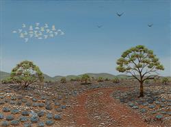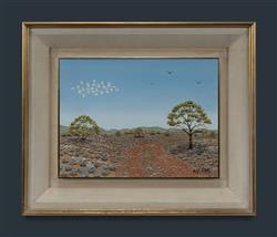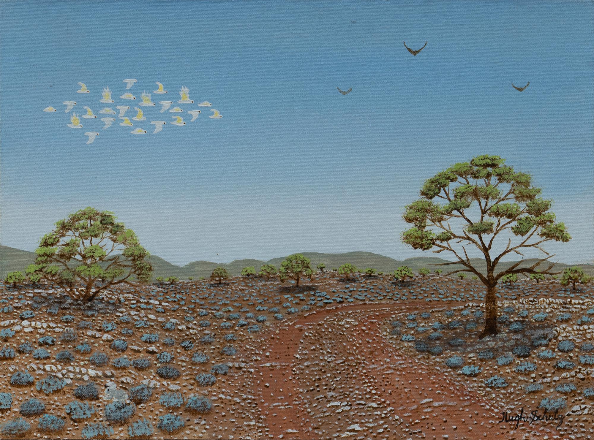 SCHULZ, Hugh (1921-2005) Outback Road with Flight of Cockatoos Oil on Canvas on Board 30x40cmEstimate $800-1,500