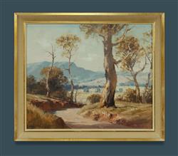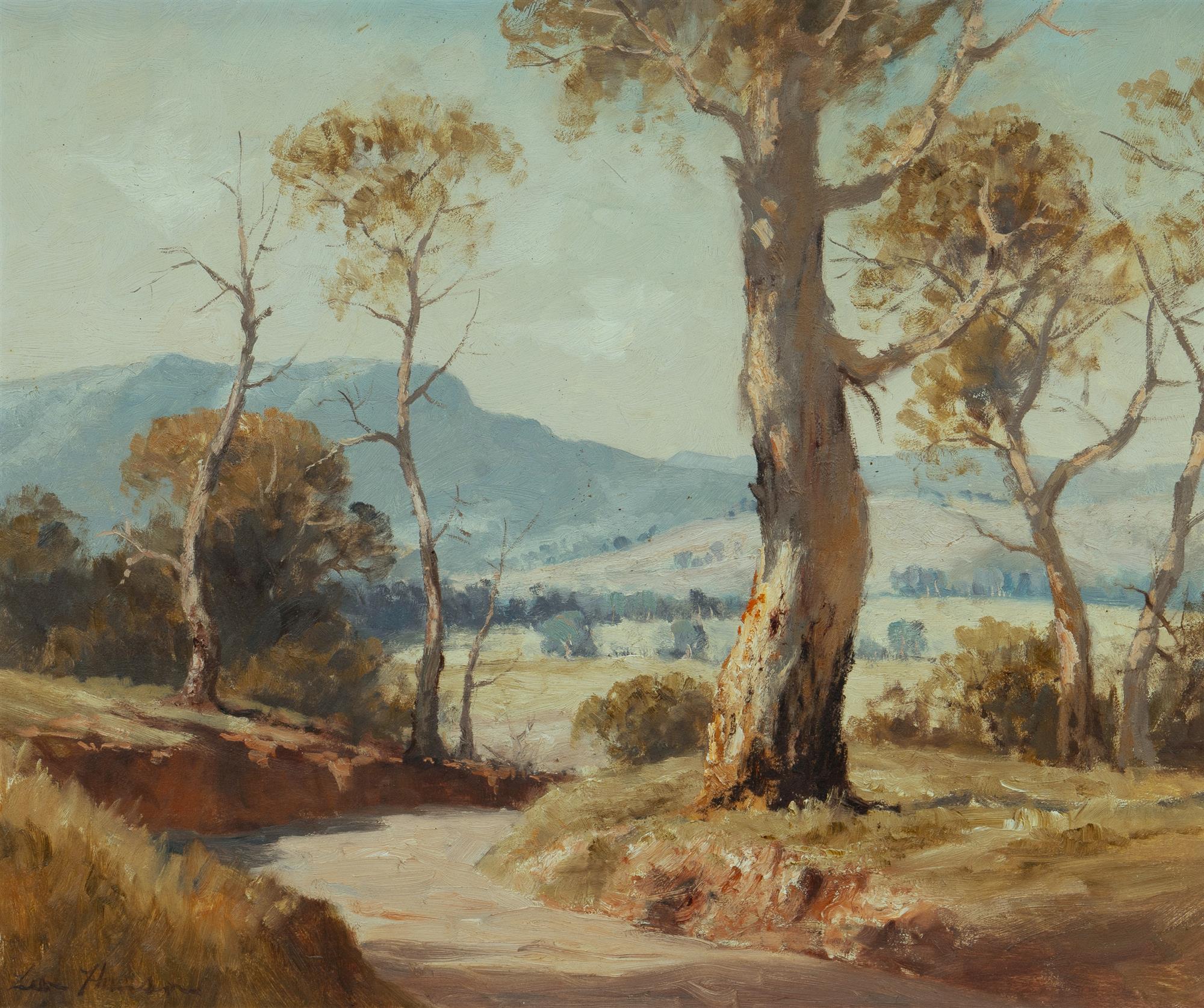 HANSON, Leon (1918-2011) 'In the Goulburn Valley' Label verso for Gordon Galleries, Sydney. Oil on Board 49x59cmEstimate $250-450