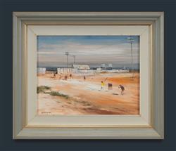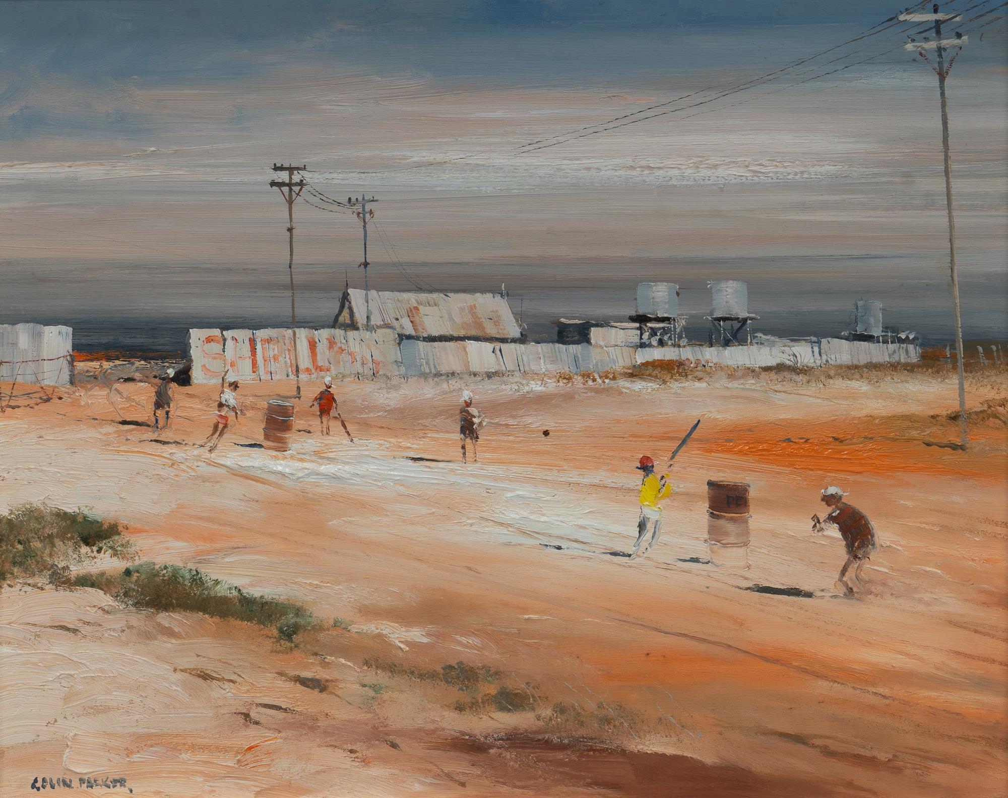 PARKER, Colin (b.1941) 'The Dusty Cricket Game, Tibooburra, Western N.S.W.' Oil on Board 38x49.5cmEstimate $500-800