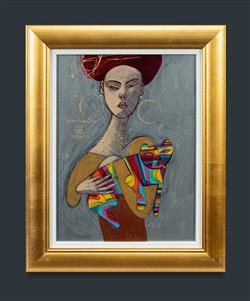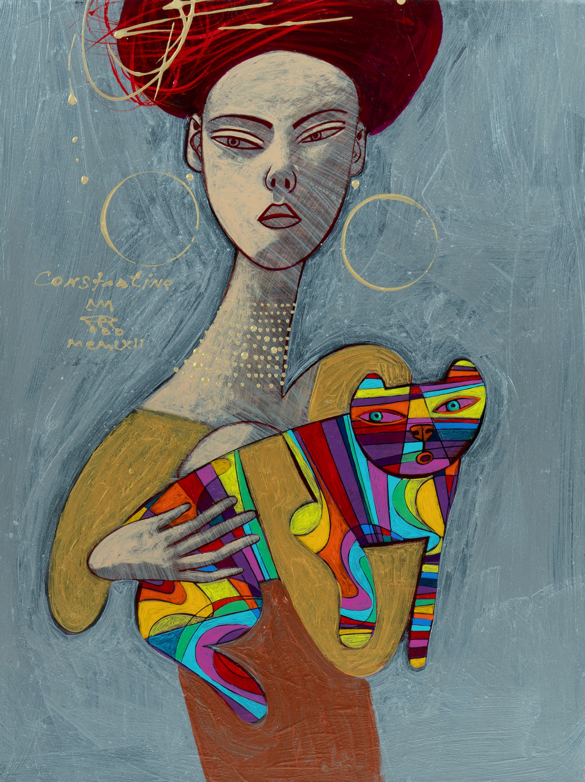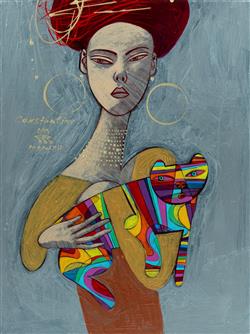 POPOV, Constantine (Swiss/Australian b.1962) Woman with Multi-coloured Cat, 2022. Profusely inscribed verso. Acrylic on Board 40x30cmEstimate $350-550