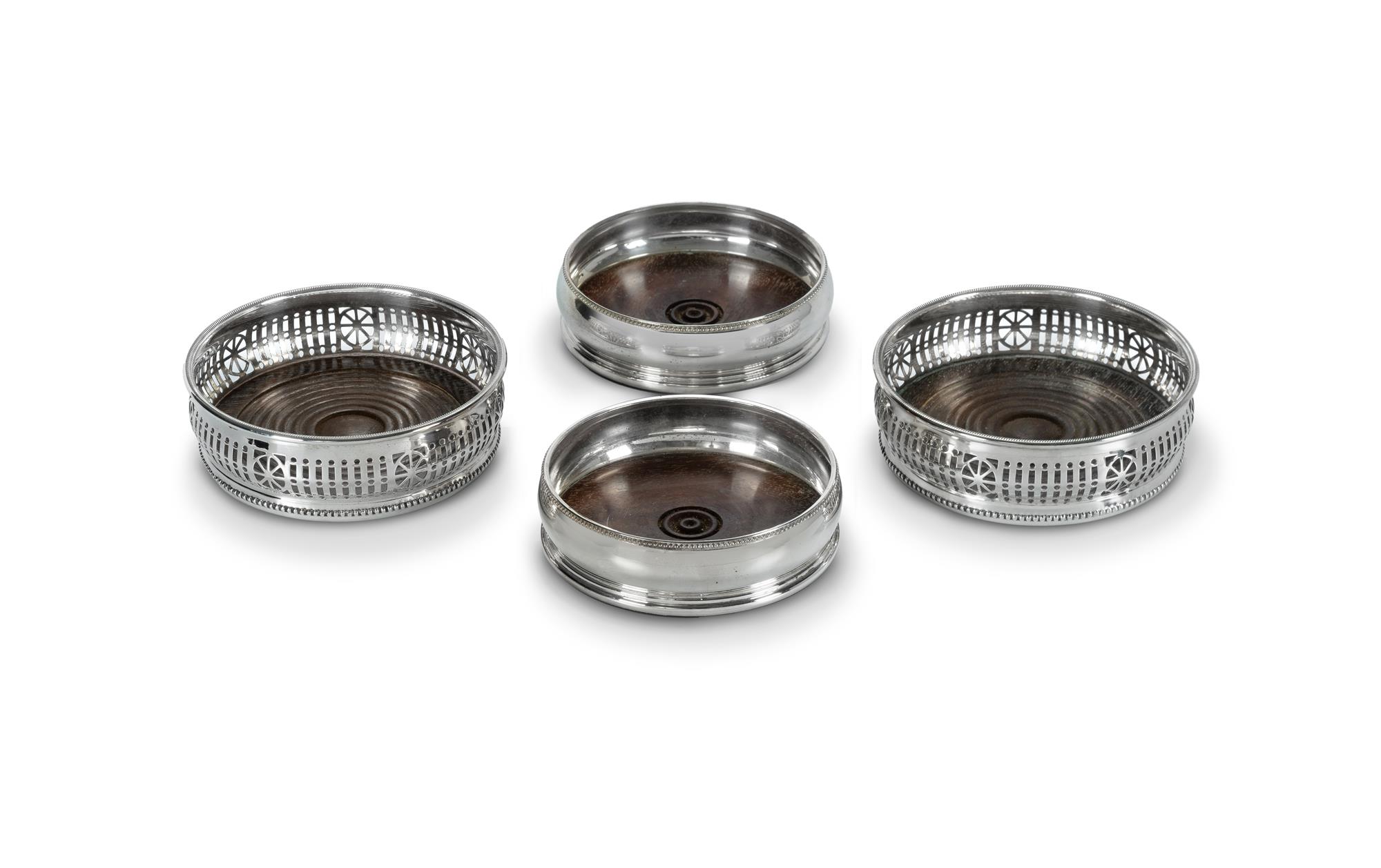 2 Prs Silver Plated Bottle Coasters. By Barker Ellis, with pierced galleries, and an unmarked pair of Old Sheffield plates. PROVENANCE: Estate Late Prue Socha, Sydney.Estimate $60-100