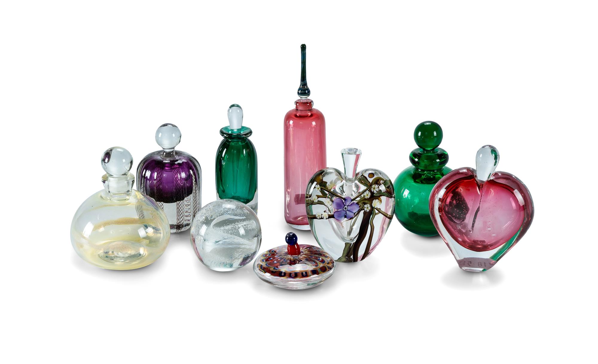 Group of Hand Blown Art Glass Perfume Bottles. Includes Archimede SEGUSO, Julio SANTOS, and others. Together with a Caithness pastel paper weight. (H14cm tallest) PROVENANCE: Estate Late Prue Socha, Sydney.Estimate $200-400