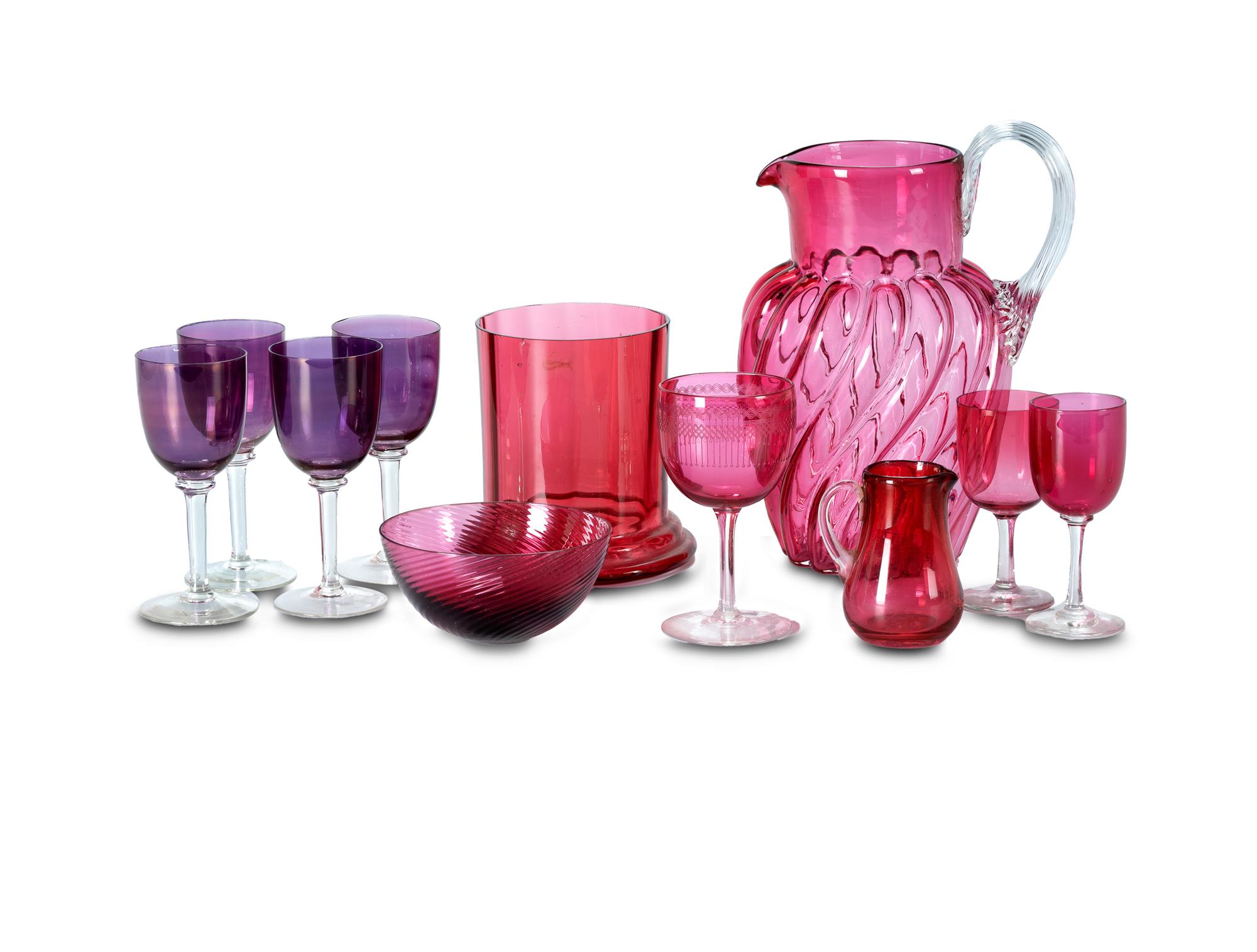 Group of 19th/20th C Coloured Glass Items. Includes Victorian ruby glass ewer (H24cm); ruby and purple cordial glasses; and a cranberry glass finger bowl. PROVENANCE: Estate Late Prue Socha, Sydney.Estimate $80-150