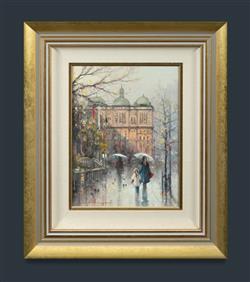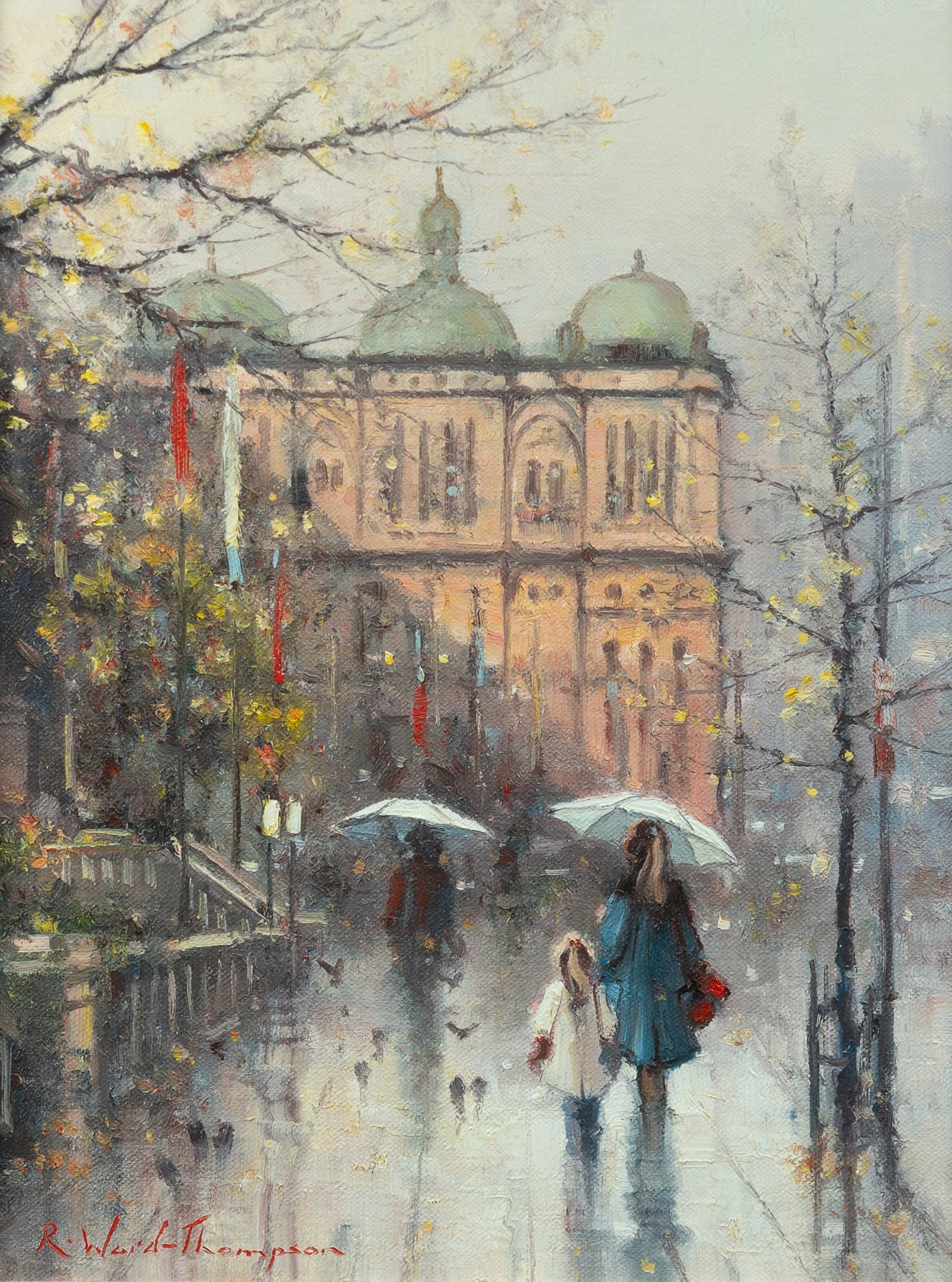 WARD-THOMPSON, Ramon (b.1941) 'Rainy Morning, Town Hall' Oil on Canvas on Board 30x22.5cmEstimate $150-250