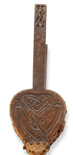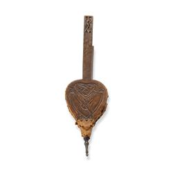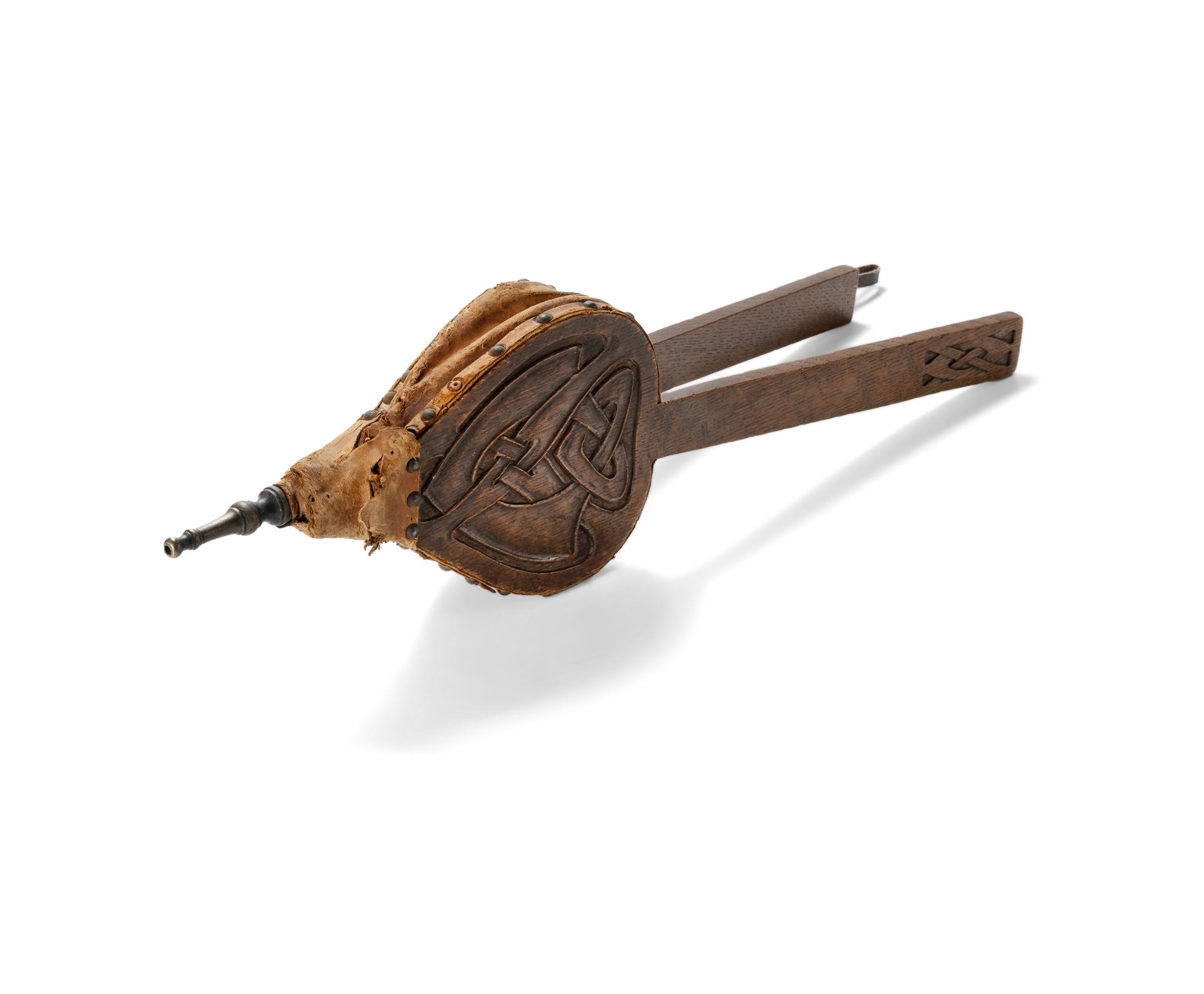 Arts & Crafts Oak 'Otley' Fire Bellows. Carved with entrelac motifs, attrib. Archibald Knox for Liberty & Co. c.1907. Leather perished. (L75cm)