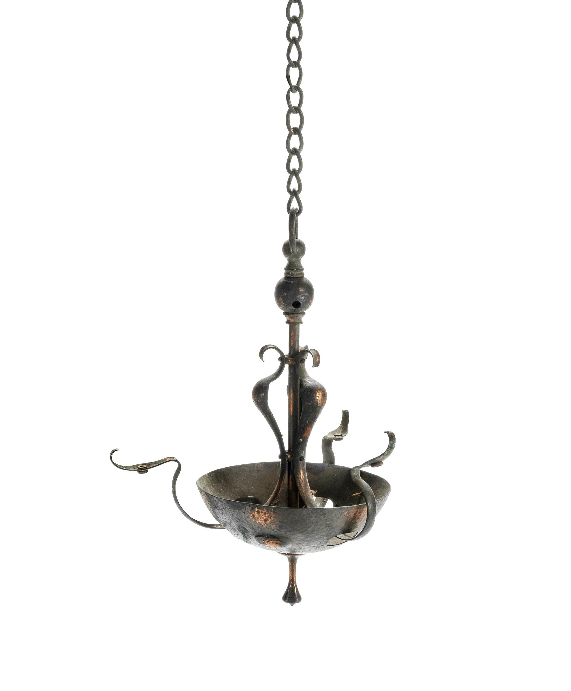 British Arts & Crafts Hammered Copper 3 Branch Hanging Pendant Electrolier. Early 20th C. Unwired. H45cm (approx.)Estimate $50-100