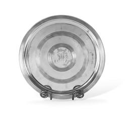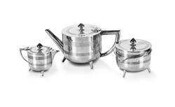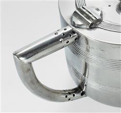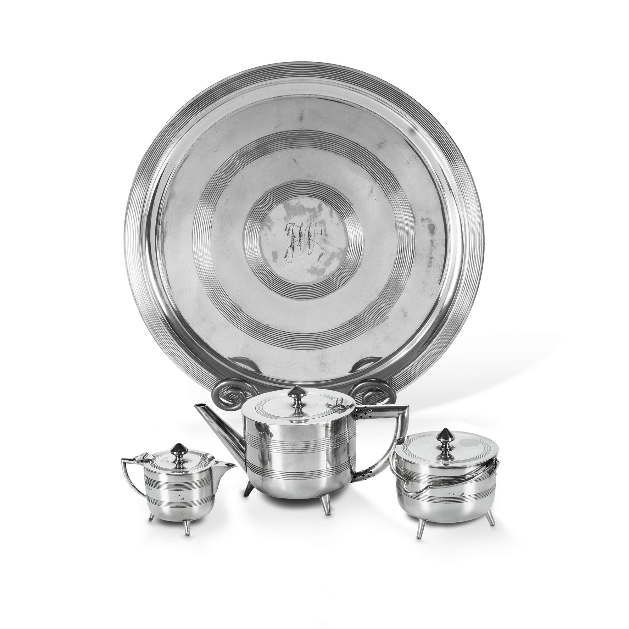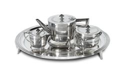 Walker & Hall Silver Plate 4 Pce Tea Set and Tray. In the style of Christopher Dresser circa 1880. Tray with engraved monogram. (Dia.37cm tray)Estimate $200-400