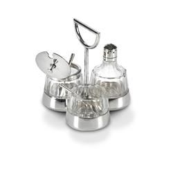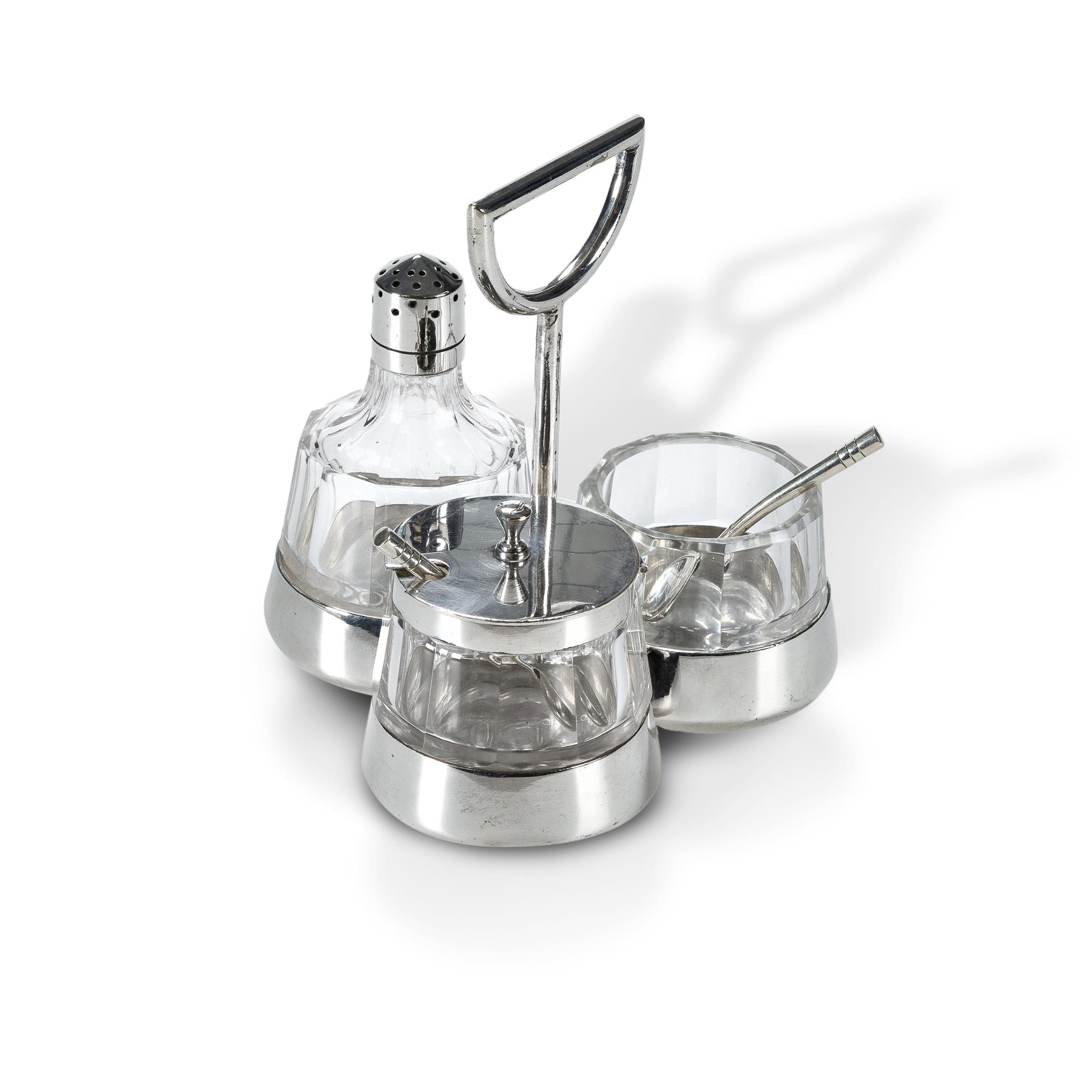 Christopher Dresser, Hukin & Heath Silver Plate and Glass Cruet Set. Model no. 2122, PODR lozenge mark for 1880. (H18.5cm)Estimate $400-800