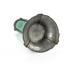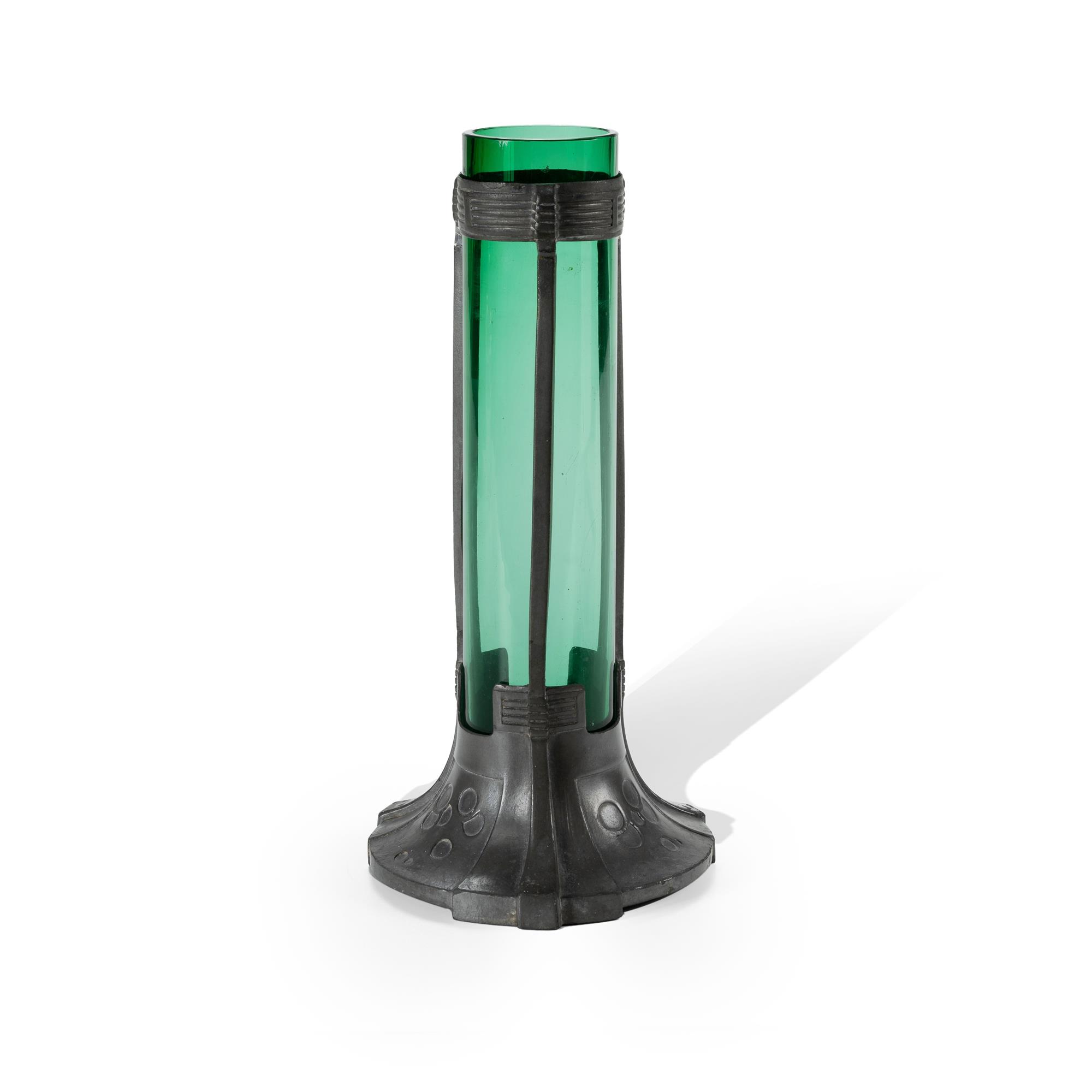 Walter Scherf & Co. Nuremberg 'Osiris' Pewter and Green Glass Vase. Model 1081 possibly designed by J.M. Olbrich or Peter Behrens. (H28cm)