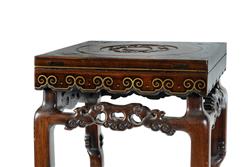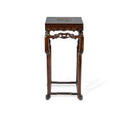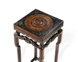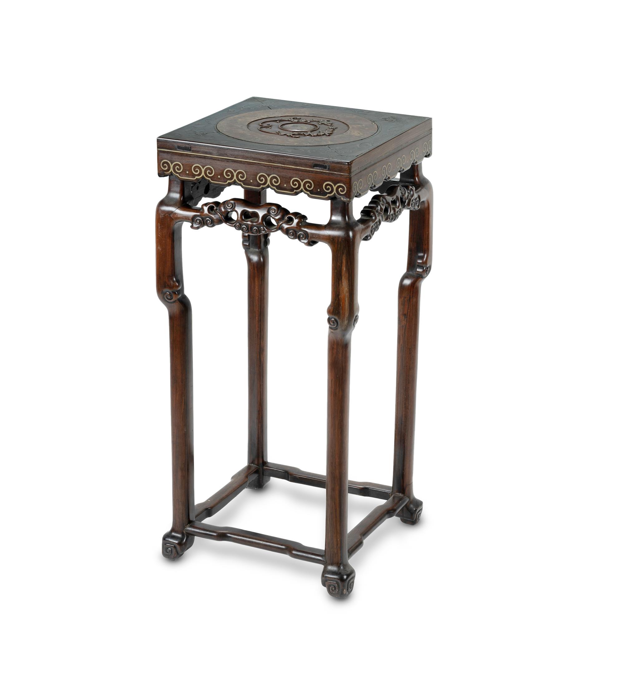 Chinese Hongmu Rosewood and Brass Inlaid Incense Stand. With dragon carved burlwood top panel, the aprons carved with lingzhi, early 20th C. (H81cm)Estimate $400-800