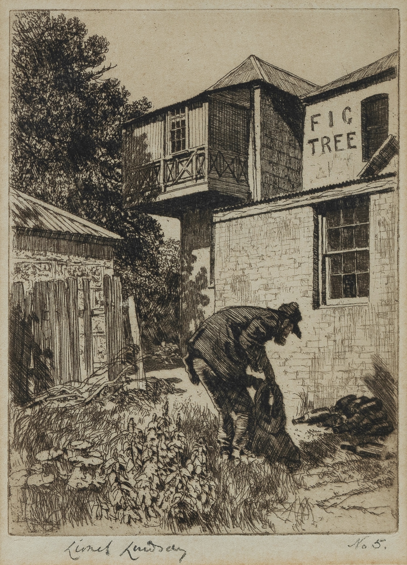 LINDSAY, Lionel (1874-1961) Bottle Collector, Fig Tree Hotel, North Sydney. Etching ed 5/? 13x9.5cm (image)Estimate $100-200