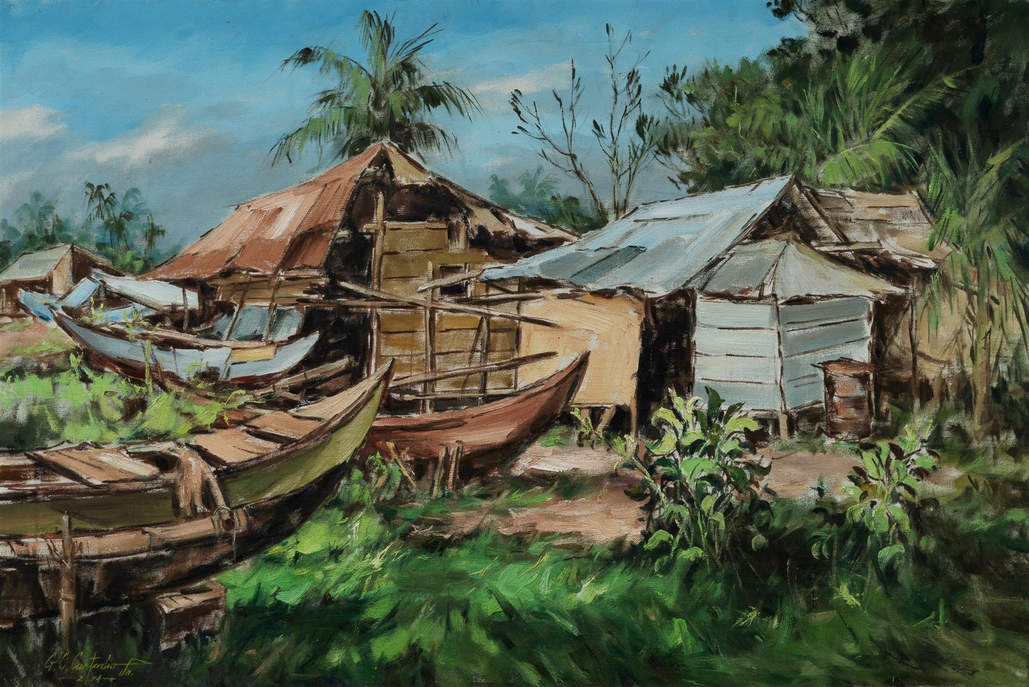 CUSTODIO, Gabriel (Philippines 1912-1993) Village Huts and Boats, 1974. Signed and dated lower left. Oil on Canvas on Board 60x90cmEstimate $600-900