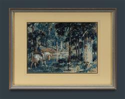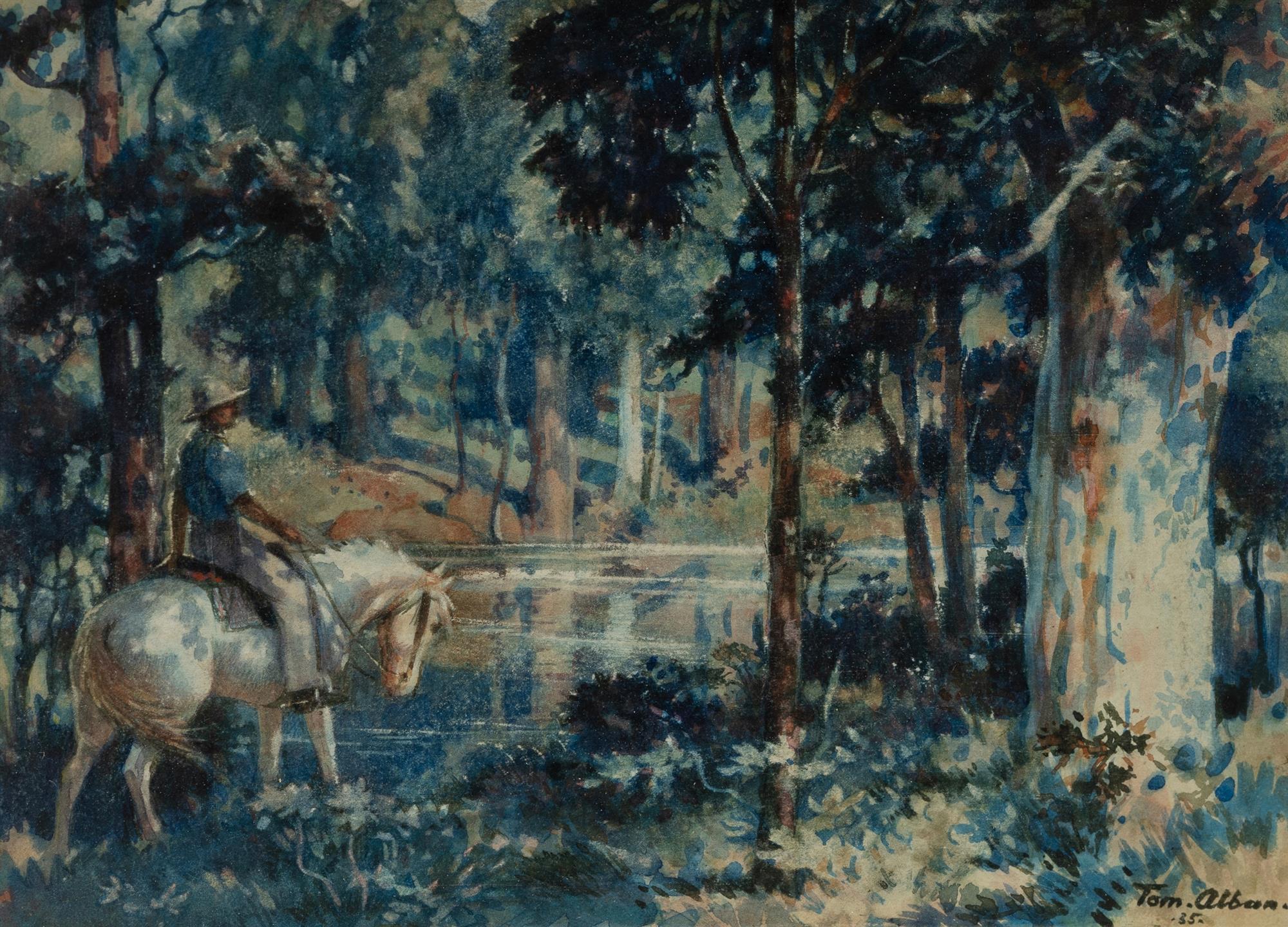 ALBAN, Tom (1887-1979) Horseman by a River, 1935. Artist inscription and provenance information verso. W/Clr 16.5x22.5cmEstimate $100-200