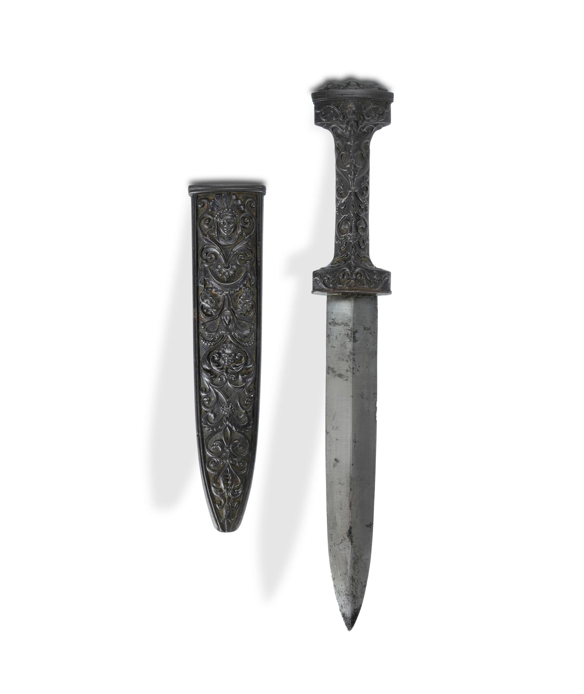 19th C 'Holbein' Dagger. With patinated cast iron hilt and scabbard, decorated in low relief. (L28cm)Estimate $250-400
