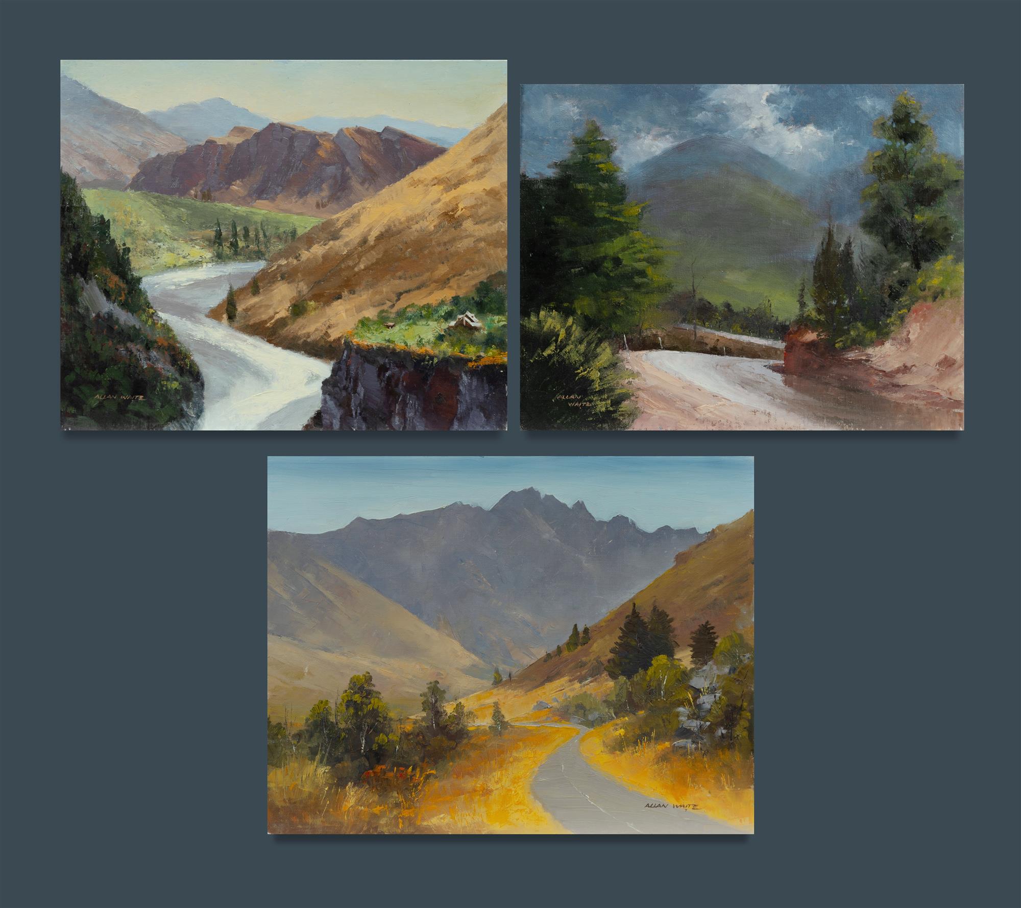 WAITE, Allan (1924-2010) (3) 'The Remarkables from Kelvin Heights, NZ' (36x46cm); 'The Shotover River, Near Arthurs Point' (38x46cm); and 'The Wet Road, Kaikoura Area, NZ' (36x46cm) Oil on Canvas Board (2)Estimate $100-200