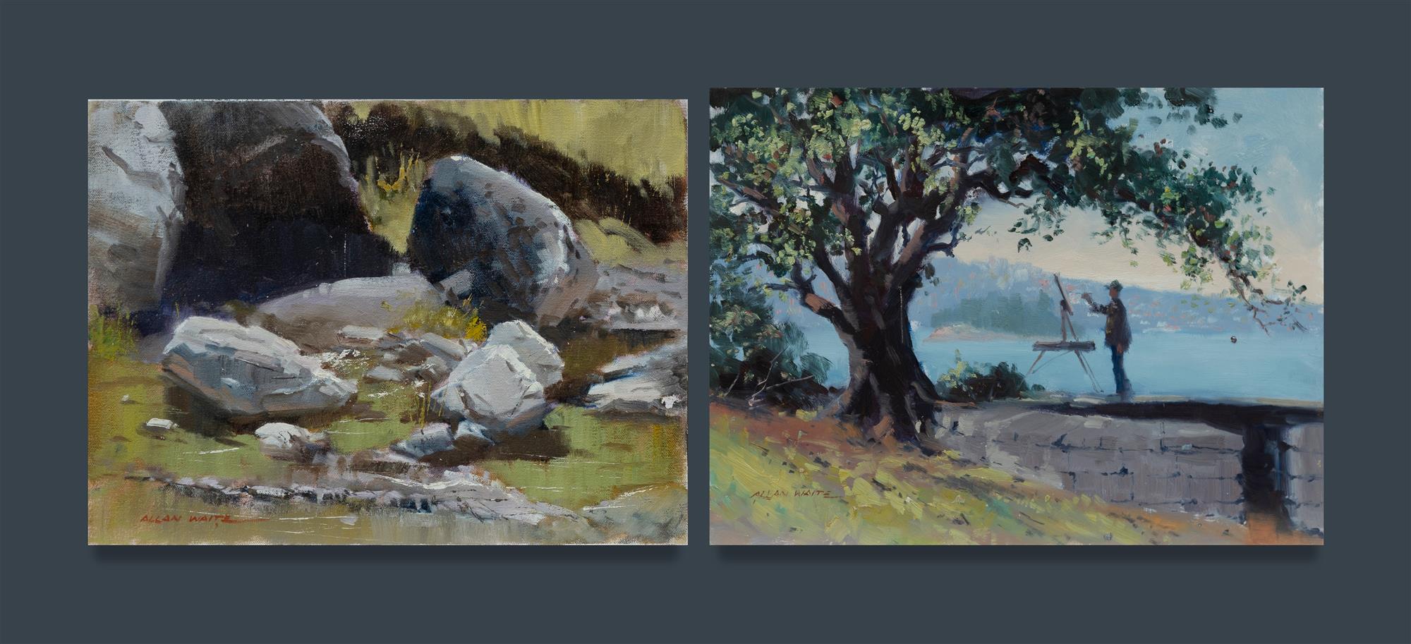 WAITE, Allan (1924-2010) 'Jacob and Joseph Creek Rocks' and 'Peter Whelan, Bradleys Head' Oil on Canvas Board (2) 30x40cm (each)Estimate $80-150
