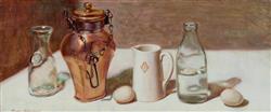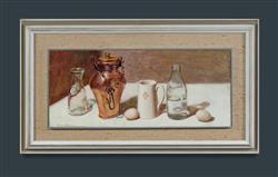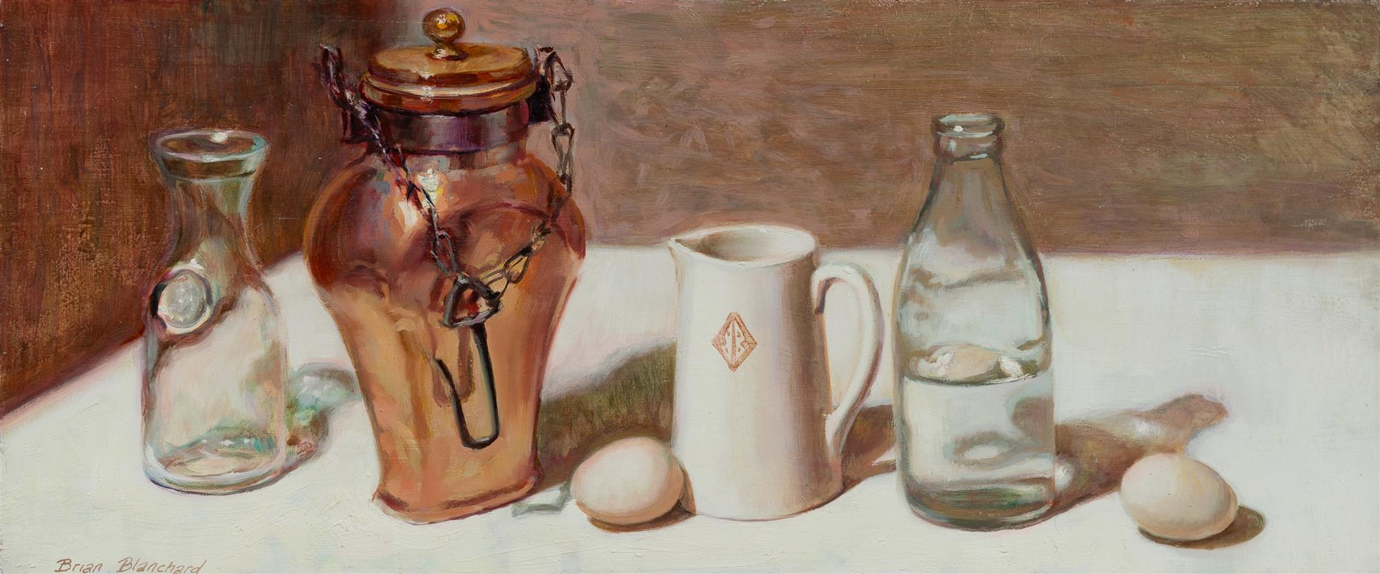 BLANCHARD, Brian (1934-2015) Eggs and Vessels Signed lower left. Oil on Board 23.5x55.5cm PROVENANCE: Family of the Artist.Estimate $250-450