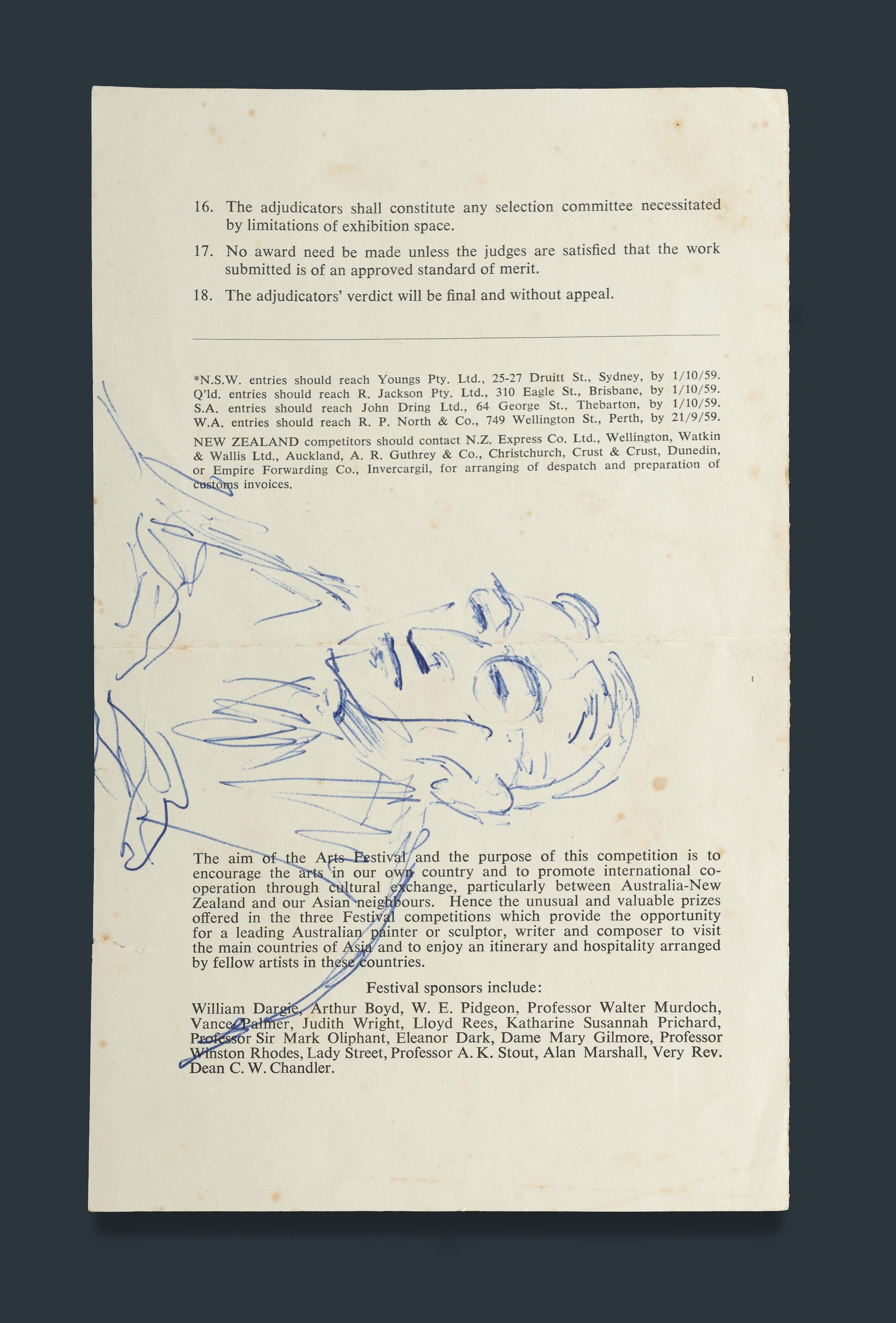 DOBELL, William (1899-1970) Study of a Man, possibly Art Luminary or Judge. Completed on national Arts Festival competition rules sheet. Unsigned. Biro 13.5x21.5cm (sheet) PROVENANCE: Family of the artist.Estimate $300-500