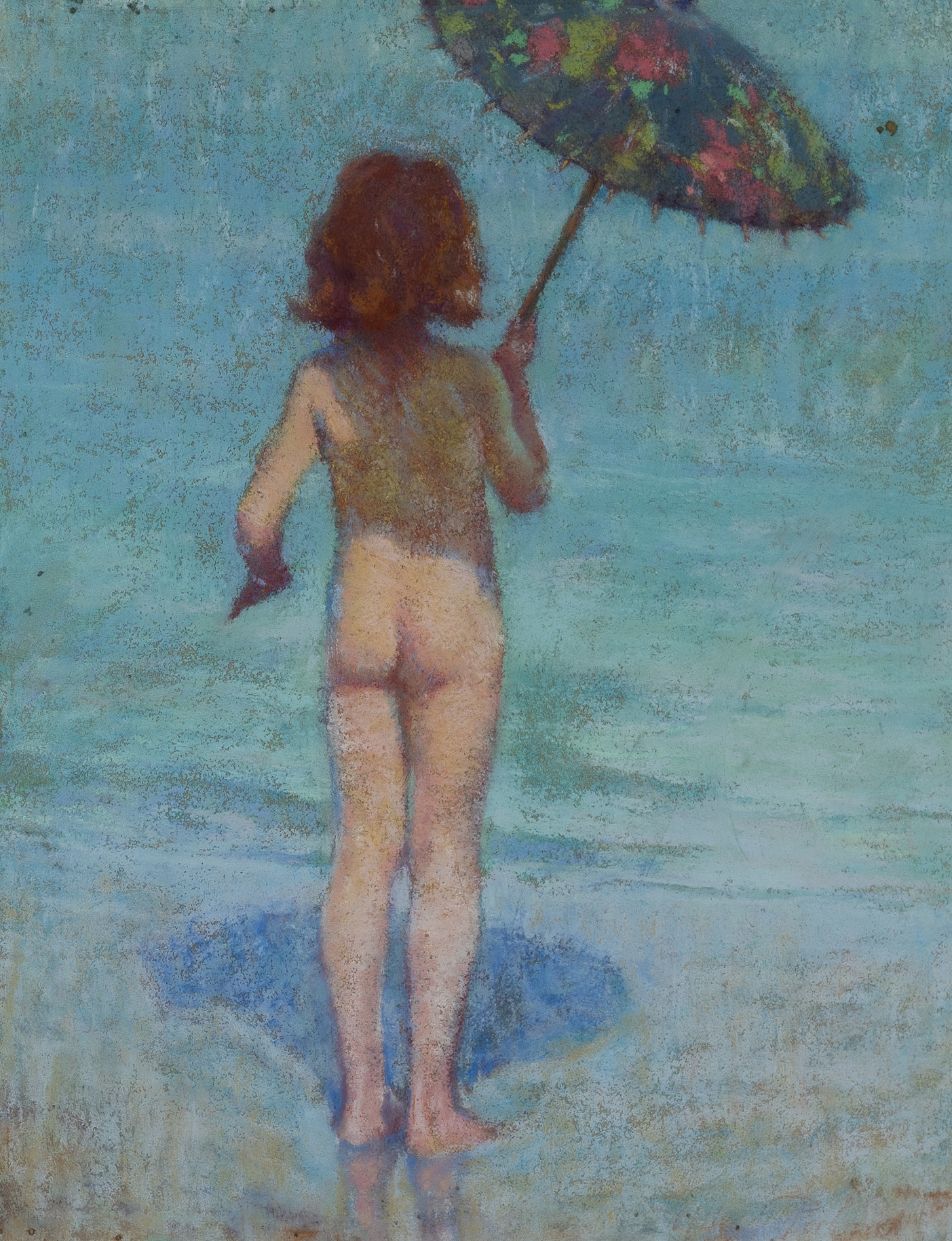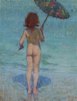 Artist Unknown Girl with Umbrella on Beach Signed indistinctly lower right. Pastel 33x25cmEstimate $100-300