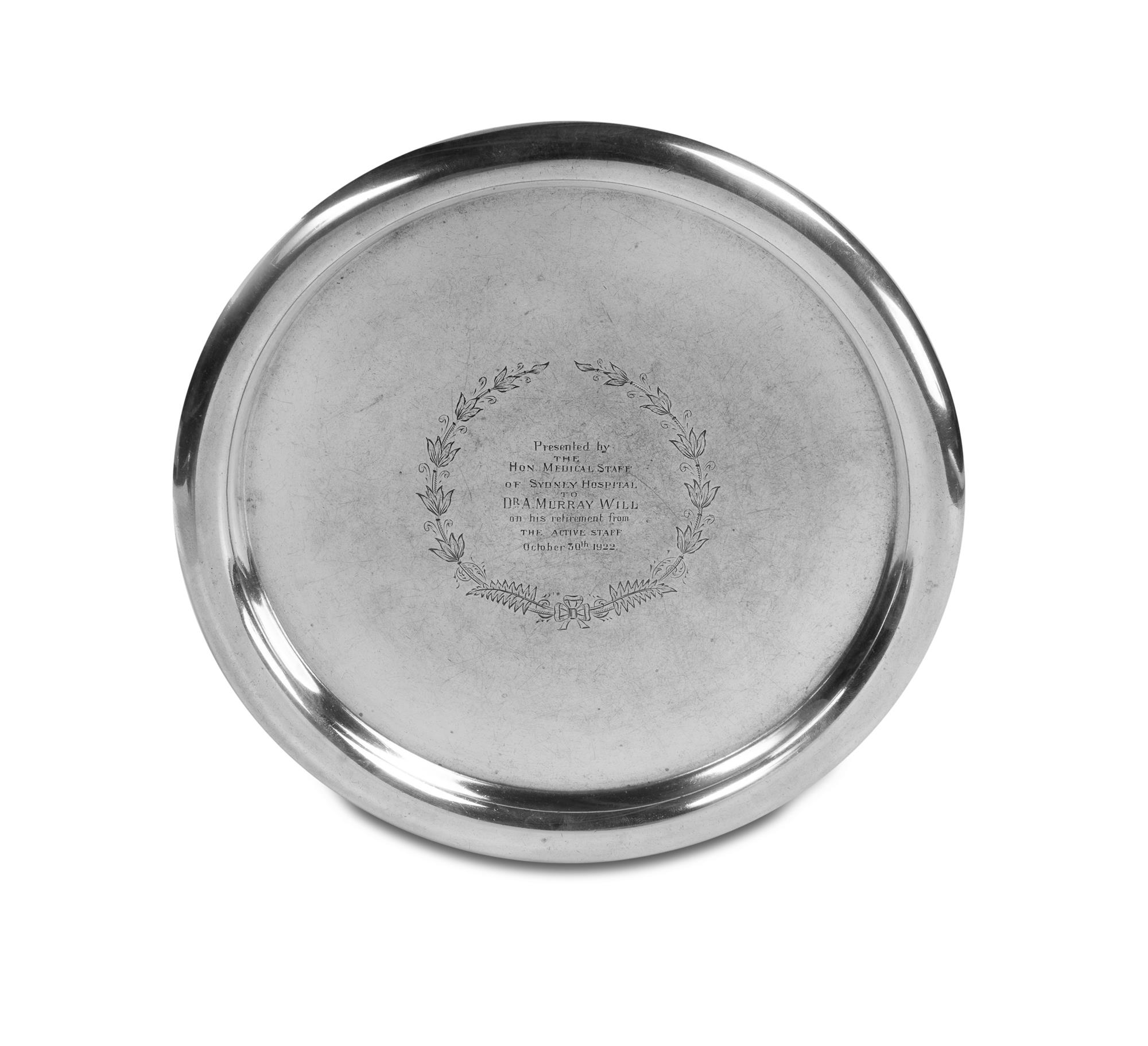 Australian Silver Presentation Card Tray By William Kerr, George St, Sydney. Inscribed within a floral wreath 'Presented by the Hon. medical staff of Sydney Hospital to Dr A. Murray-Will on his retirement from the active staff, October 30th 1922'. (Dia. 21cm W374g)