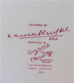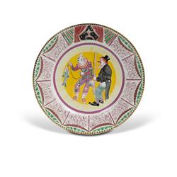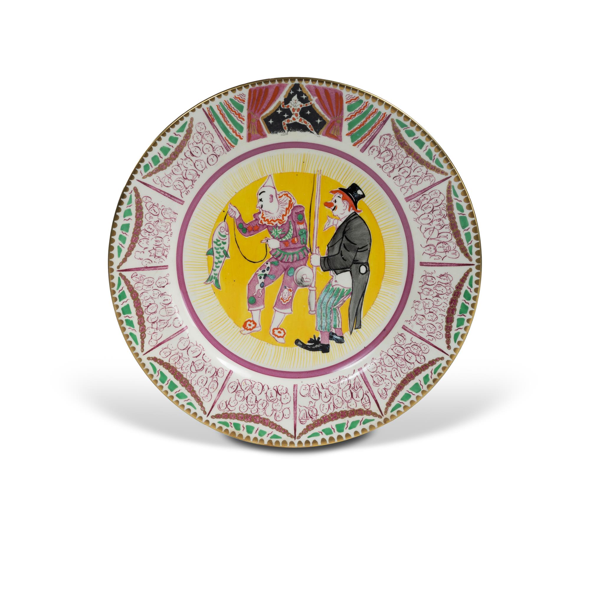 Clarice Cliff Circus Pattern Bizarre Plate, c.1934. Designed by Dame Laura Knight. Hand-painted with clowns. (Dia.23cm) PROVENANCE: Collection John D. Chesterman, Sydney.Estimate $400-800
