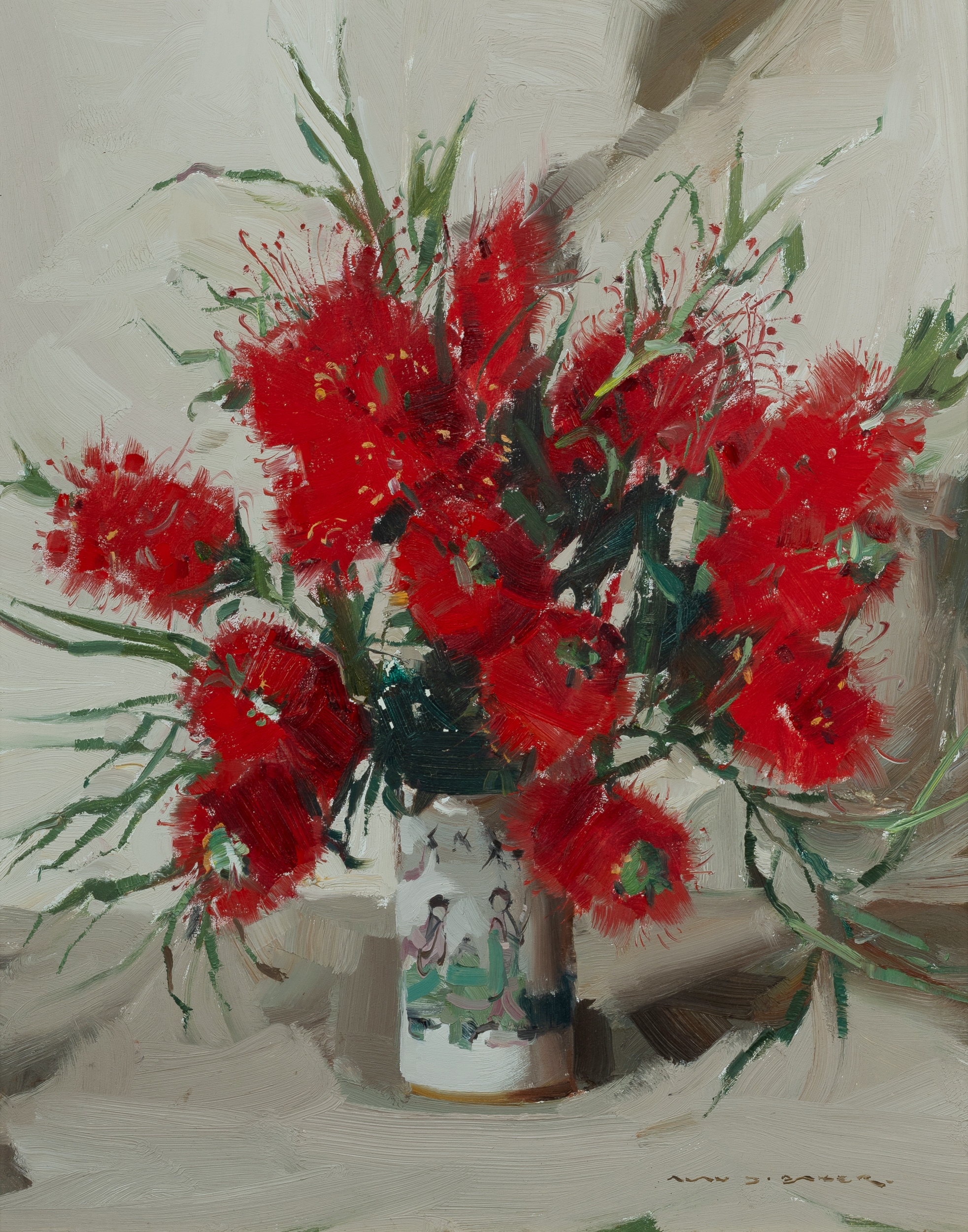 BAKER, Alan Douglas (1914-1987) 'Grevilleas and Bottlebrush' Oil on Board 49x39cmEstimate $1,200-1,800