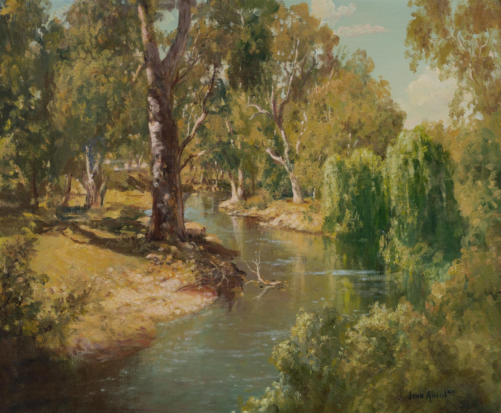 ALLCOT, John (1888-1973) Meandering River with Dappled Light Oil on Canvas Board 48.5x58.5cmEstimate $1,200-2,500