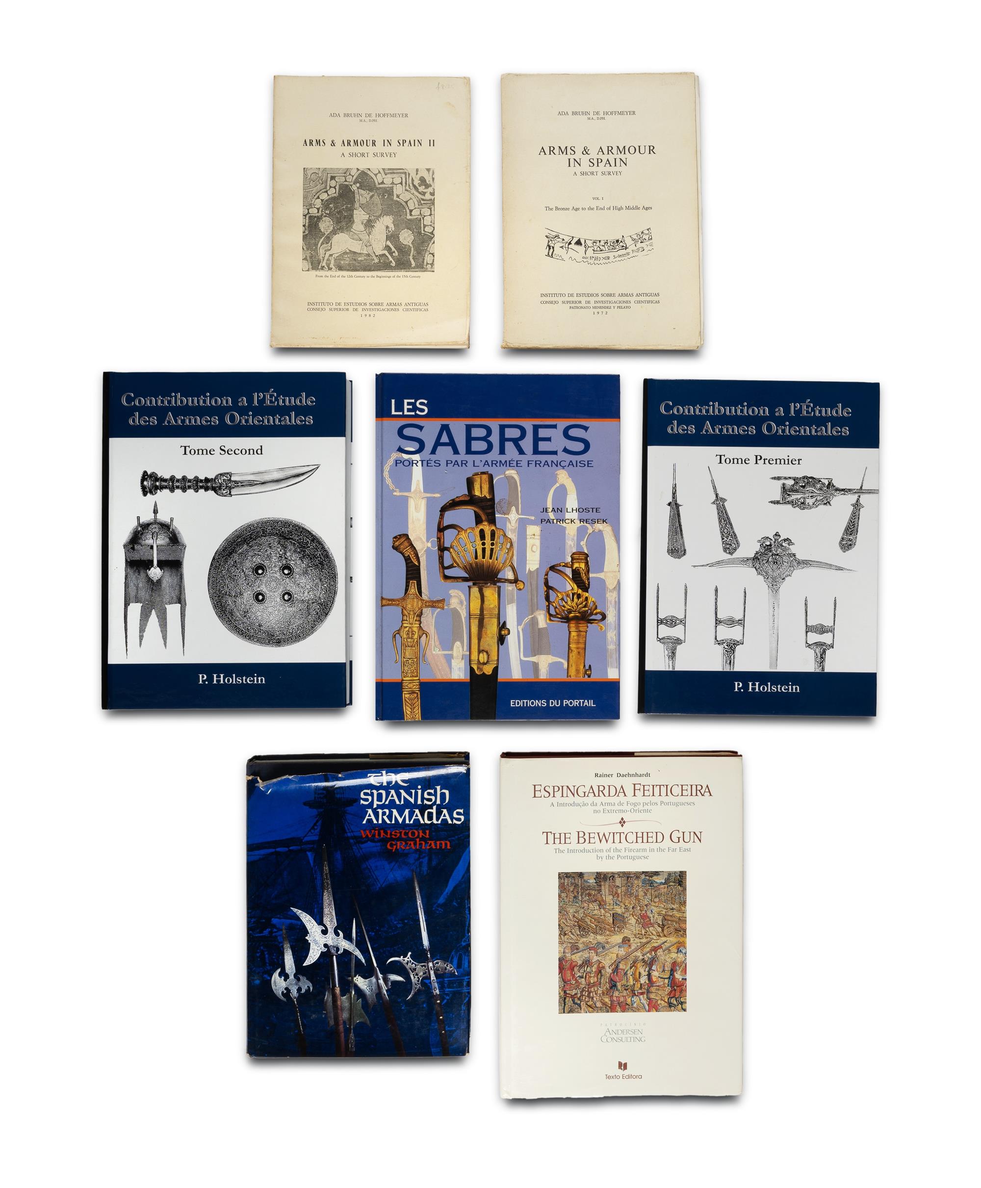 BOOKS (7), Seven Volumes about Spanish, French & Portuguese Arms Including Bruhn de Hoffmeyer, Ada 'Arms & Armour in Spain; A Short Survey', Institute of Studies on Ancient Weapons, Madrid, Volumes 1 (1972) and 2 (1982), softcovers. 4 volumes with English translation and 3 French language volumes. 31x22cm (largest)