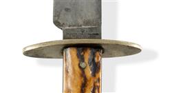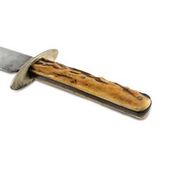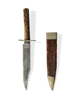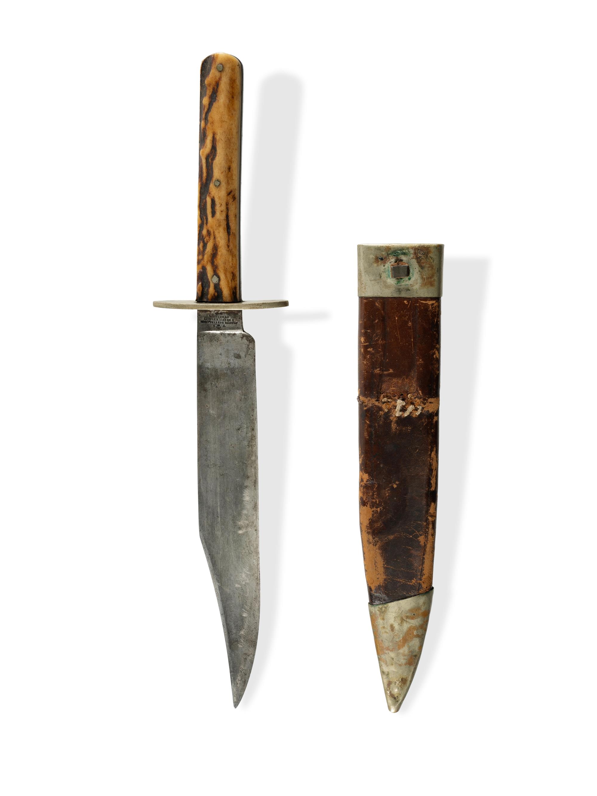 Victorian Joseph Rodgers & Sons Bowie Knife Clip pointed blade stamped to ricasso 'V.R. Joseph Rodgers & Sons, 6 Norfolk Street Sheffield'. Oval nickel silver guard, staghorn slab grips fixed by 3 pins. Original leather and nickel silver scabbard with old repair. L34.5cm (incl. scabbard)