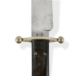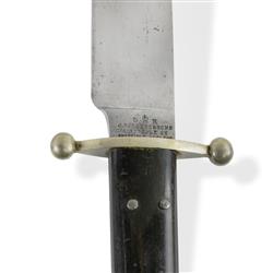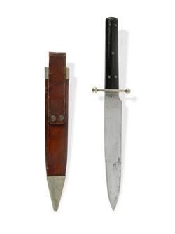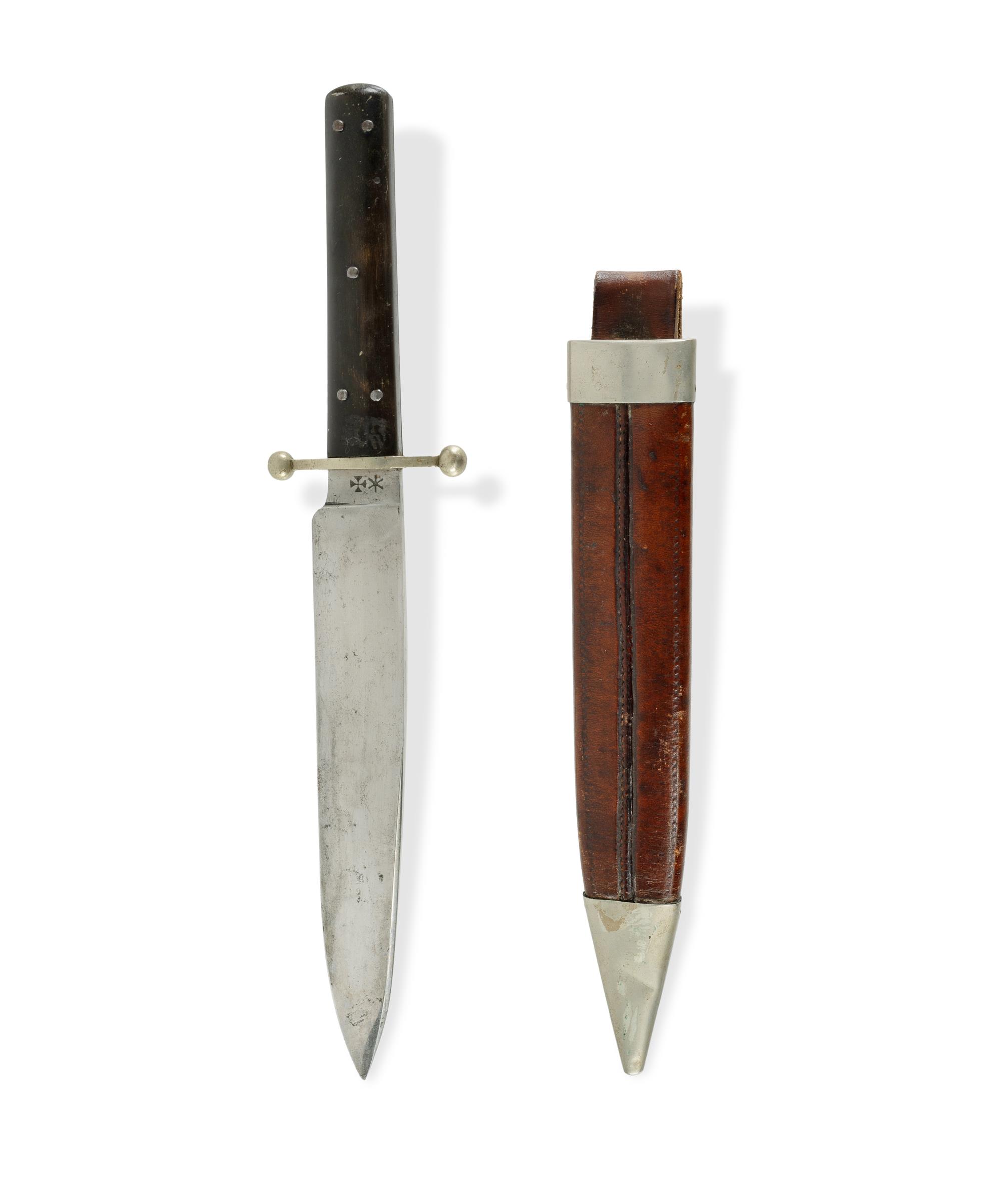 19th C Drop Point Bowie Joseph Rodgers & Sons. Ricasso stamped 'G.R. J. Rodgers & Sons 6 Norfolk Street Sheffield, England'. Nickel silver guard with ball terminals, horn slab grips. With original scabbard. (L29cm)
