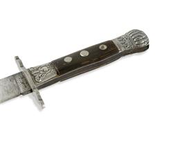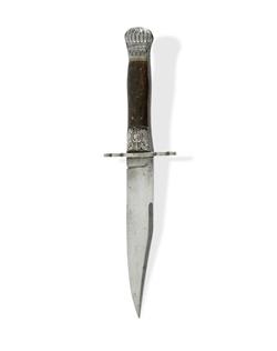 19th C Sheffield Bowie Knife Morton & Davis. Clip point blade with false edge. Faint traces of original etched blade decoration obscured by period sharpening grind marks. The ricasso stamped 'Stanley Morton & Davis, celebrated bowie, Sheffield'. Nickel silver guard, bolster and pommel. Horn scale grips. (L27cm) PROVENANCE: From the collection of the late Warren MallardEstimate $500-1,000