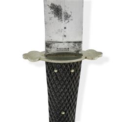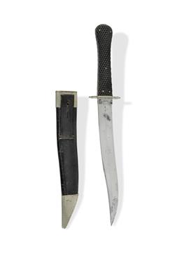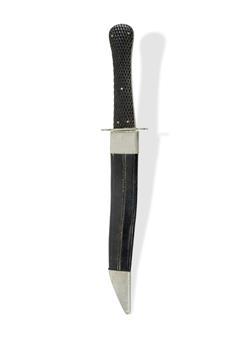 Large Late 19th C Scottish Bowie Ruddiman. Clip point recurved blade, stamped 'Ruddiman Edinburgh' to ricasso. Nickel silver guard, chequered scale grips. With original scabbard. (L35.5cm) Ex Ian Cummins Collection.