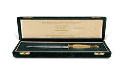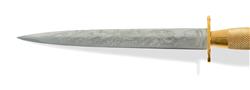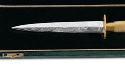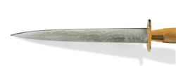 Fairbairn Sykes WWII Commemorative Commando Knife Wilkinson Swords. In a fitted green velvet case. Blade etched both sides with scroll banner 'Accept Nothing Less Than Full Victory' obverse 'In Honour of the D-Day Invasion sixth of June 1944'. With a gold plated brass hilt. (L30.5cm)