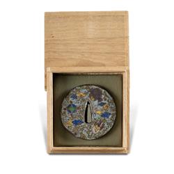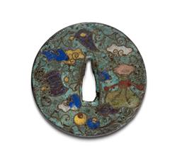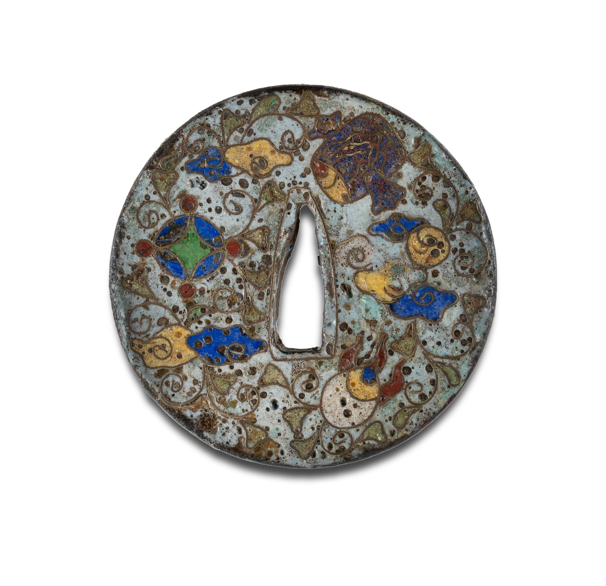 Edo Period Japanese Cloisonne Tsuba Circular form, with decoration of auspicious objects amongst scrolling vines on a pale blue ground. (Dia.7.5cm) PROVENANCE: From the collection of the late Warren MallardEstimate $200-400