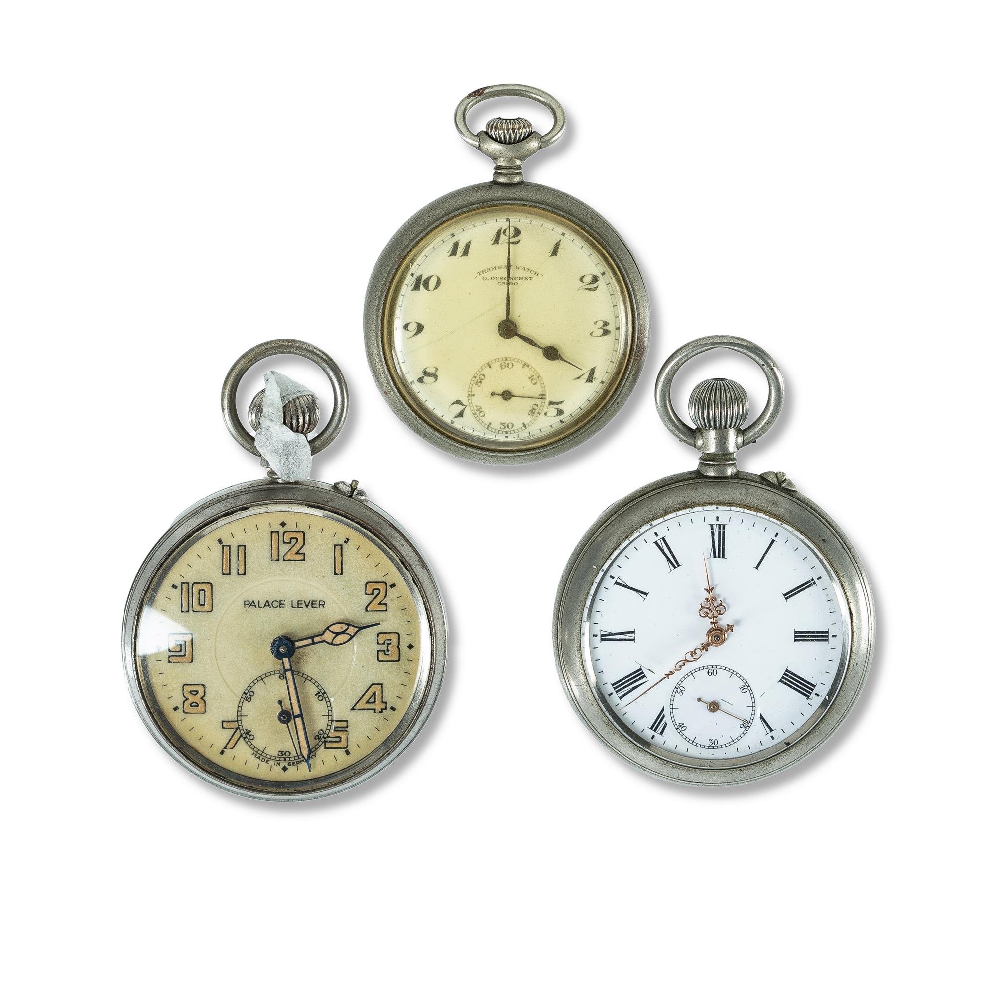3 Nickel Cased Pocket Watches Including hunting case cylinder movement, running, star in crescent mark, crown wind pin set; 2 open face: 'Palace Lever', running, loose crown; 'Tramway' watch, cairo not running, 15 jewel lever movement.Estimate $40-80