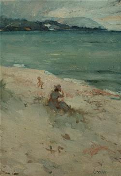 Attrib. Frank CROZIER, (1883-1948) Mother and Child on Beach Signed lower right. Oil on Board 29.5x20.5cmEstimate $300-500