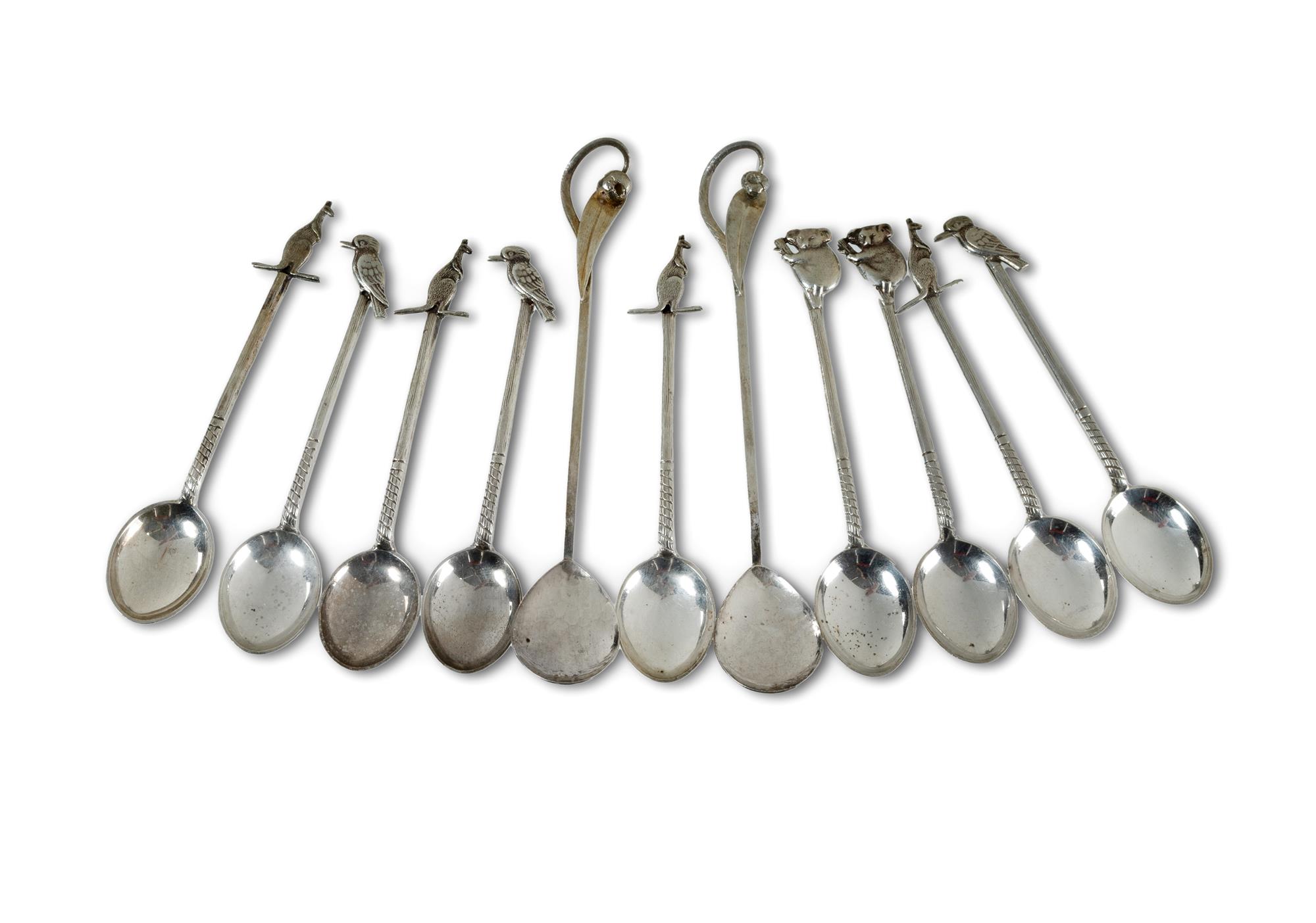 11 Various Australian Silver Teaspoons Nine spoons with Australian animal terminals, by W.J. Sanders; and two with gumleaf terminals, by Sargisons of Hobart. W86.5g total (approx)