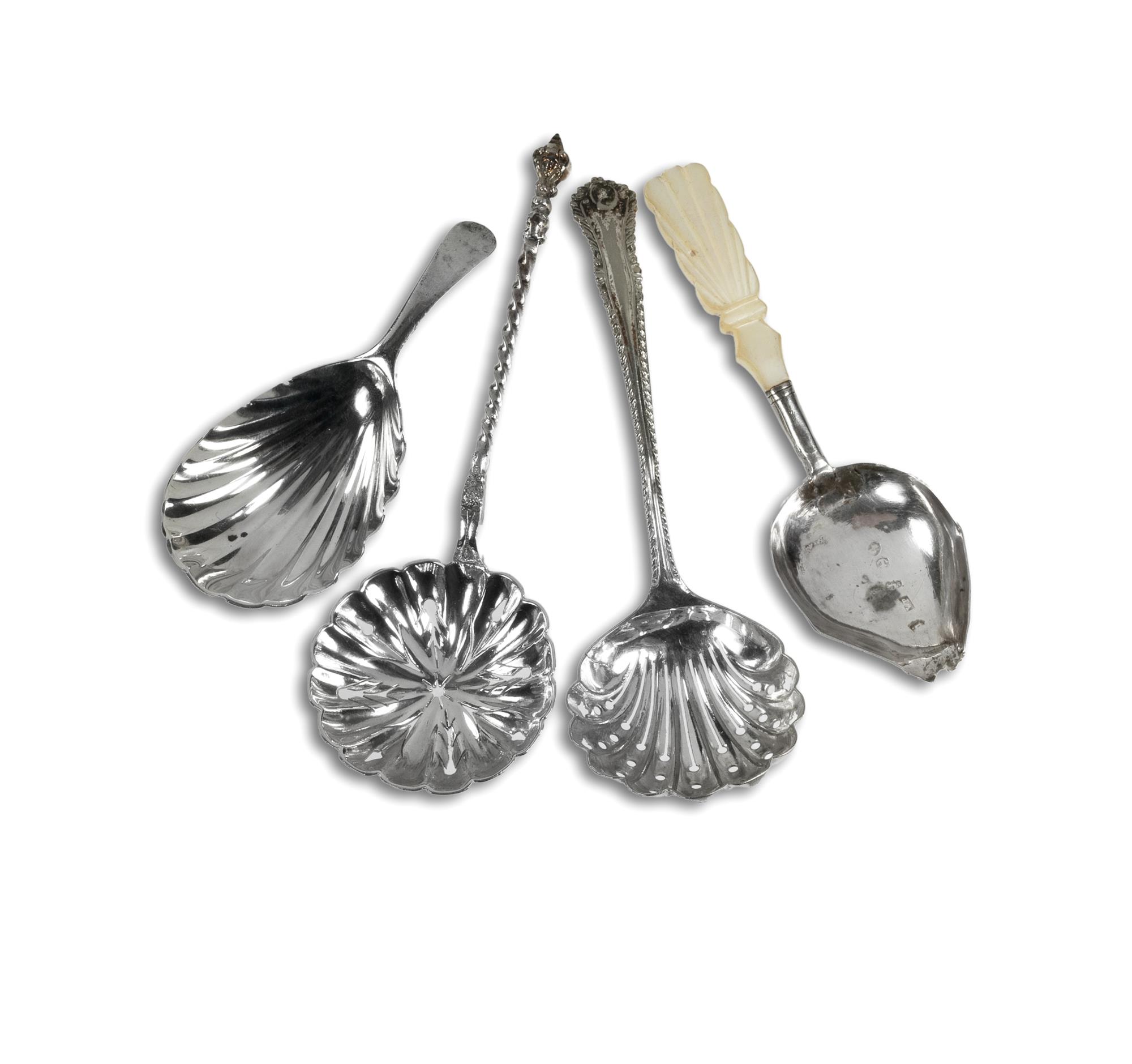 4 Various 19th C Sterling Silver Spoons Two caddy spoons and sugar sifter spoons, one caddy spoon with MoP handle. By William Pugh. W48g (total)