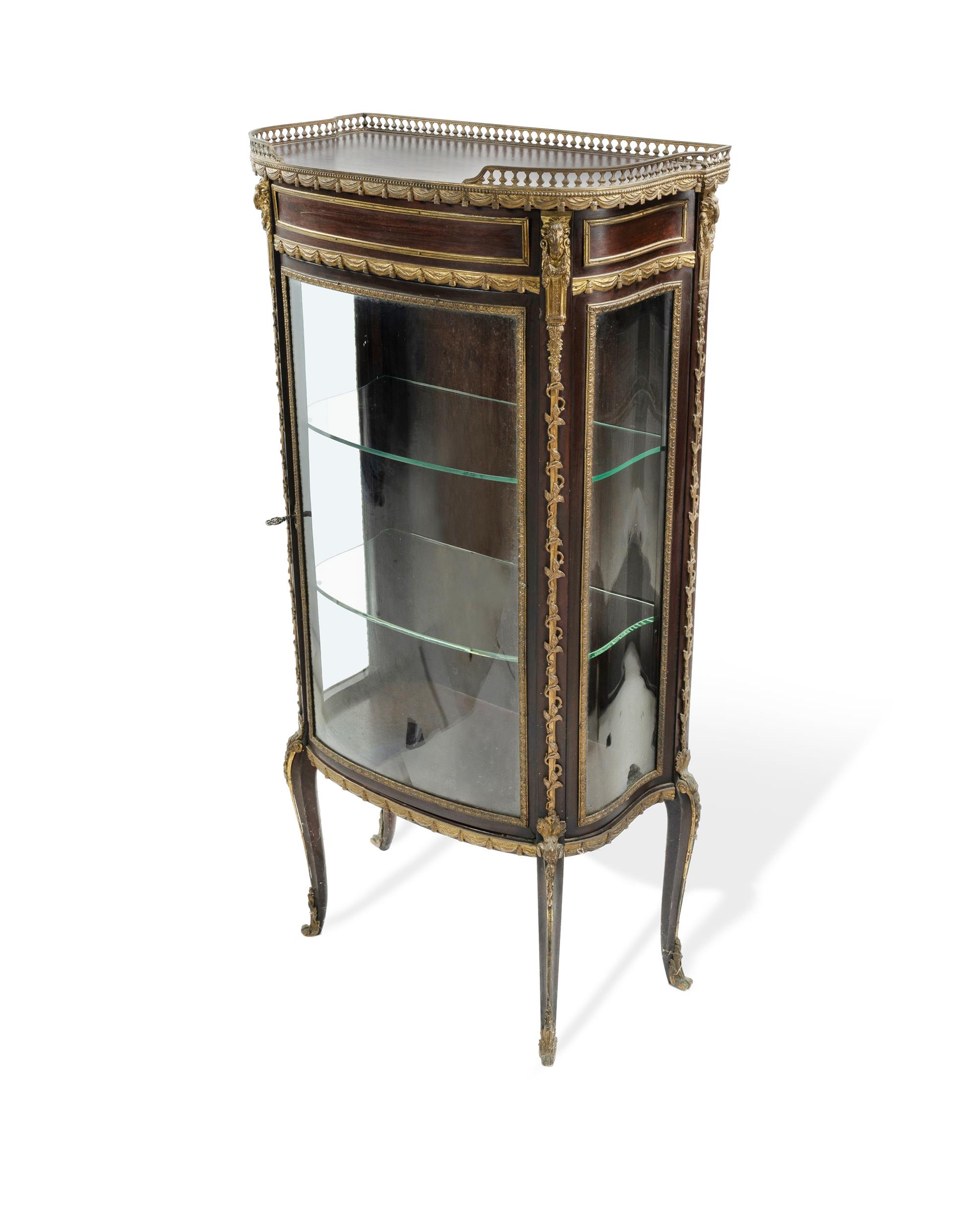 French Louis Style Bow Front Vitrine Ormolu gallery top, and 2 glass shelves, on 4 serpentine legs. (H114cm D30cm W56cm)