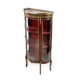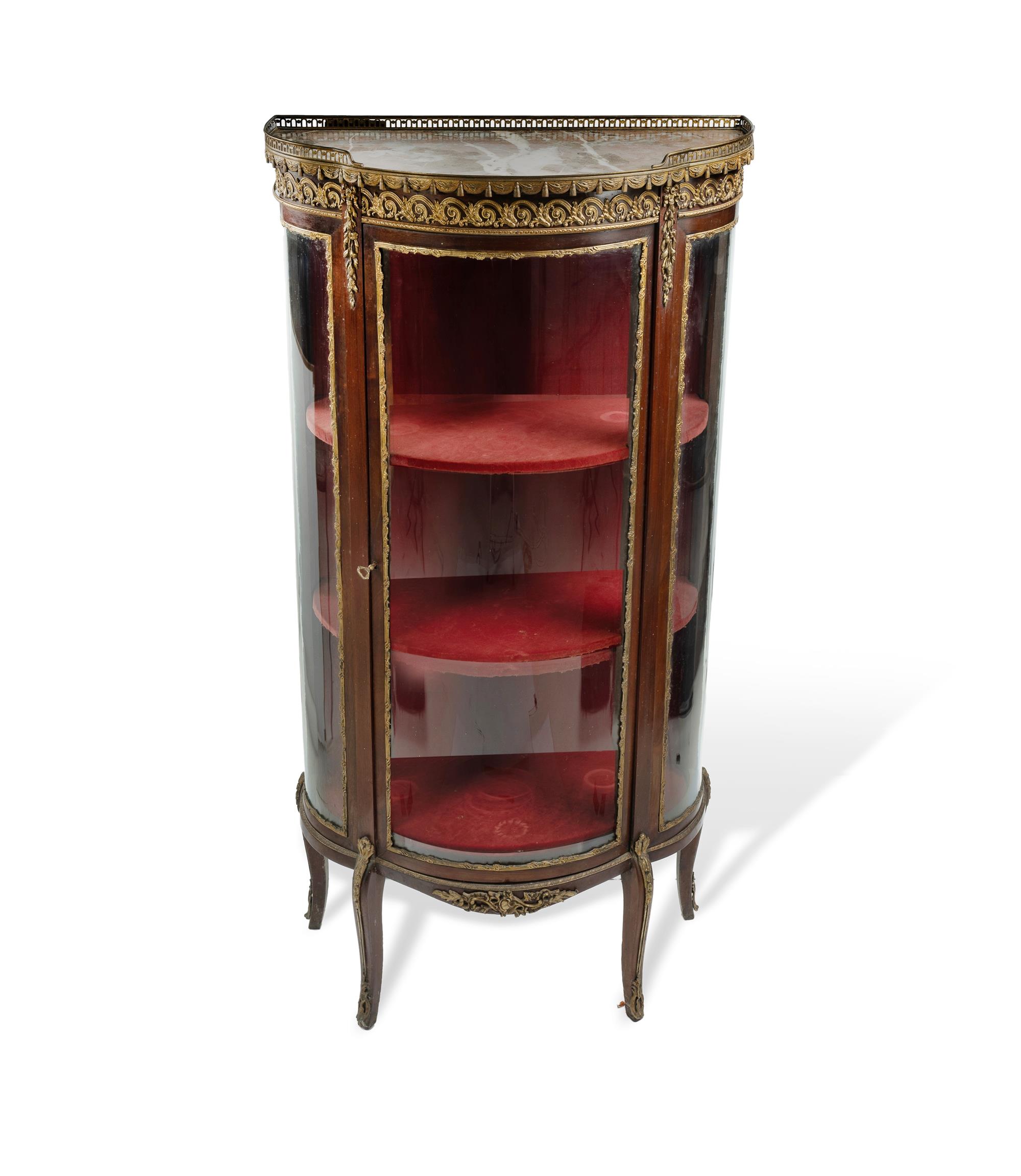 French Louis Style Bow Front Vitrine, c.1850. Rouge marble top with ormolu gallery, and red velvet lined interior. (H140cm D35cm W69cm)