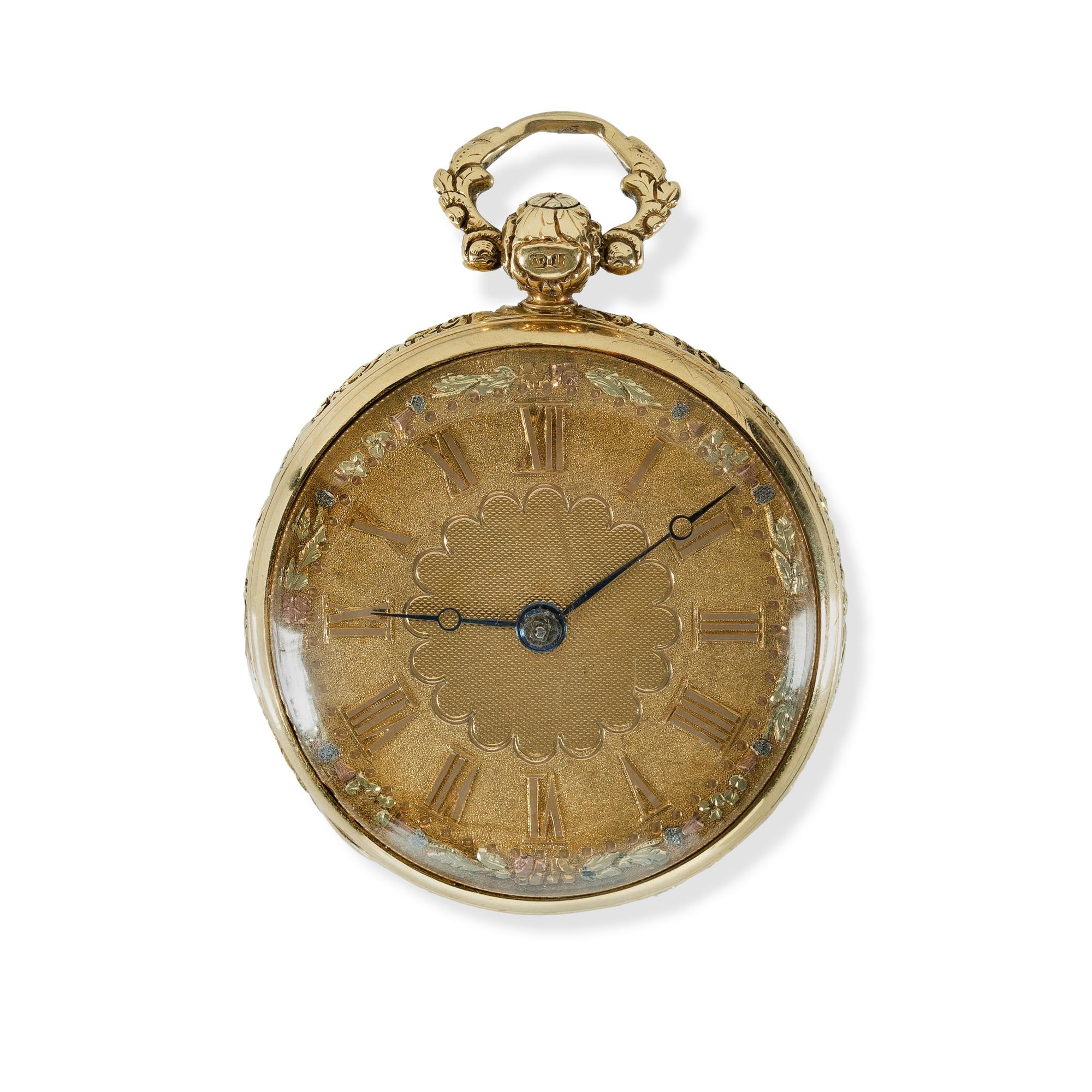 19th C Gold Cased Lever Fusee Pocket Watch By Ganthony. Two-tone gilt Roman dial, balance with diamond end cap. 18ct case with London hallmark for 1829. Running. (W71.6g)Estimate $500-1,000