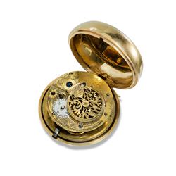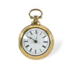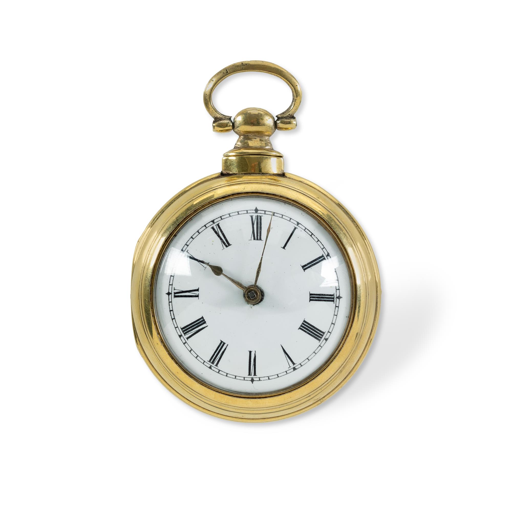 Gilt Pair-Case Keywind Verge Watch by Nelson, London. Excellent Roman enamel dial on verge movement. Matching number gilt case in good condition. Running.Estimate $300-500