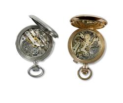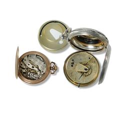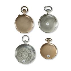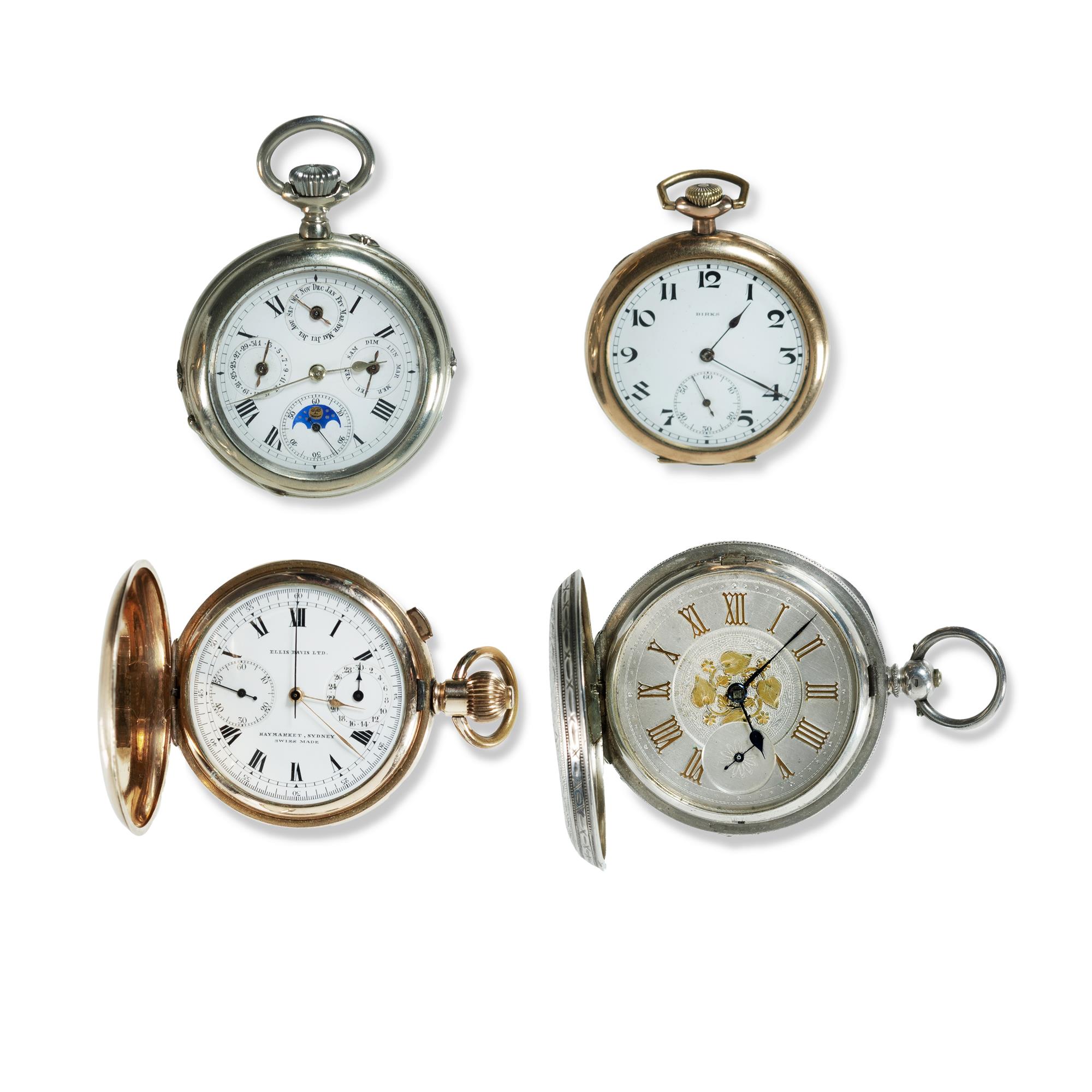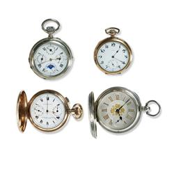 4 Various Pocket Watches Including 1916 Swiss stemwind chronometer in gold-filled case, pusher operated timer with good Roman enamel dial, good condition, functional; triple date Swiss nickel cased open face with faux moon phase, running, unserviced; key wind sterling cased hunter by Gallet & Co. lever movement mildly worn chased case; and gold-filled case open face stem wind by Birks Cavendish, 17 jewel, running.