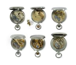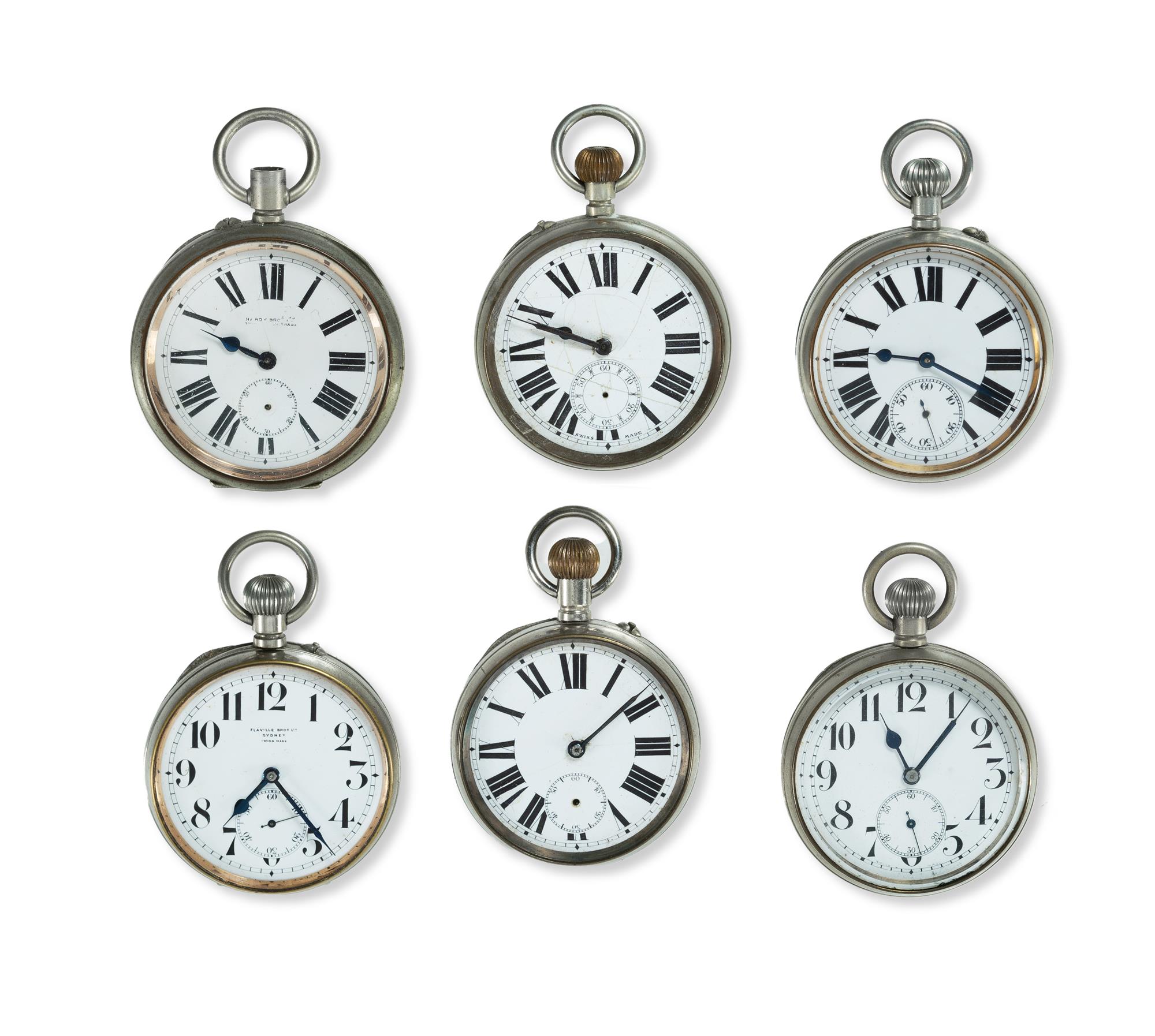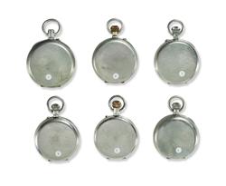 6 Various Jumbo Open Face Stem Wind Pocket Watches Most reasonable grade Swiss movements. One missing balance, all other balances good. 3 with good dials.Estimate $250-500