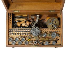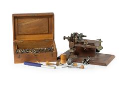 Watchmakers Lathe and Accessories Older lathe with later rheostat controlled electric motor mounted on a cedar base. Surface oxidation. Also, a chest of comprehensive accessories in good condition.Estimate $500-1,000